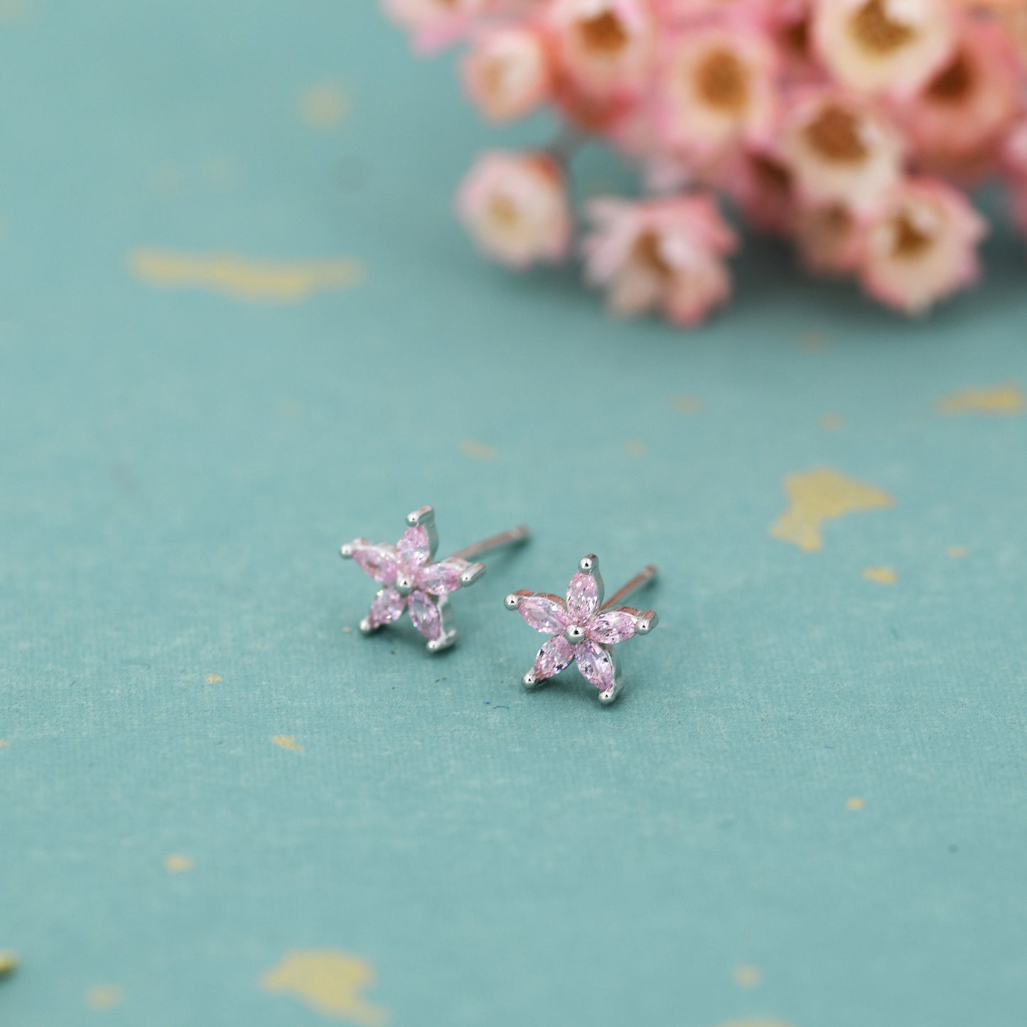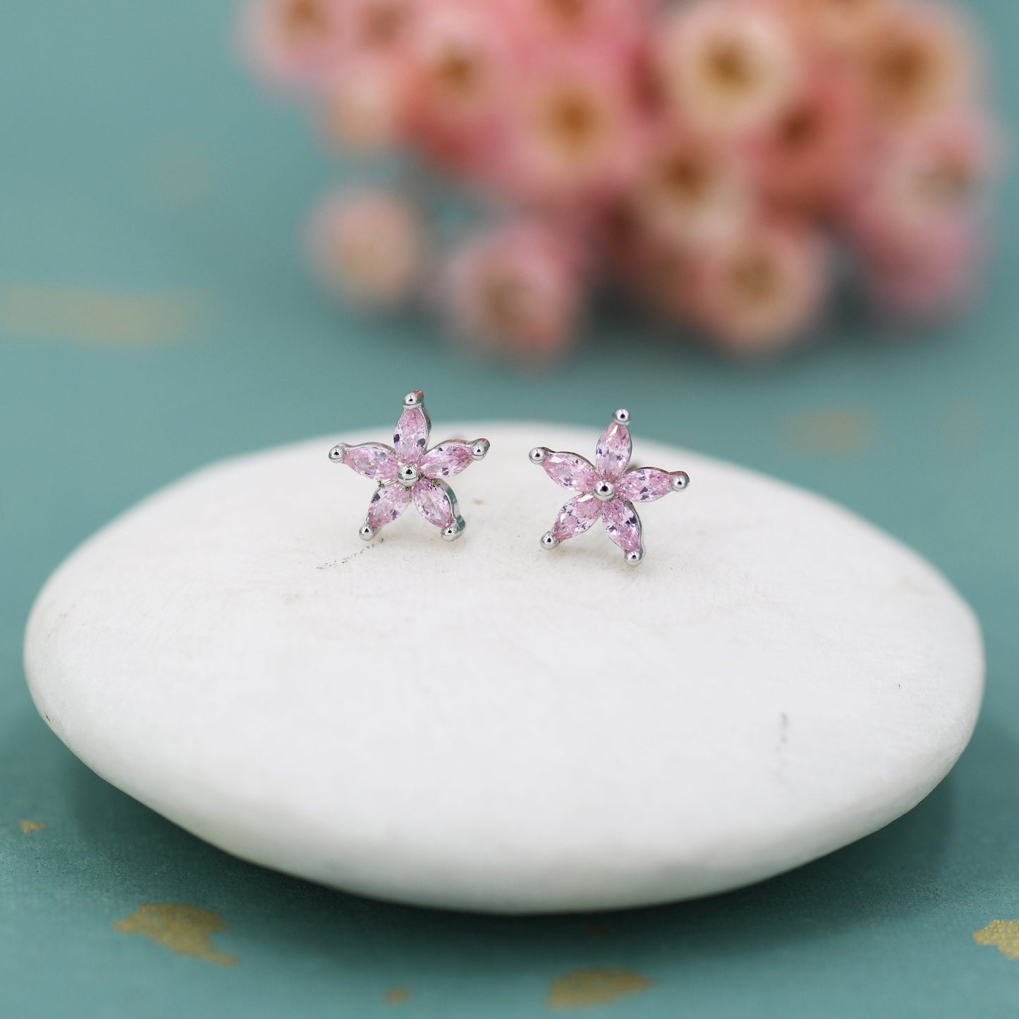 Sterling Silver Tourmaline Pink CZ Flower Stud Earrings or Screwback Earrings, Gold or Silver, Stacking Earrings