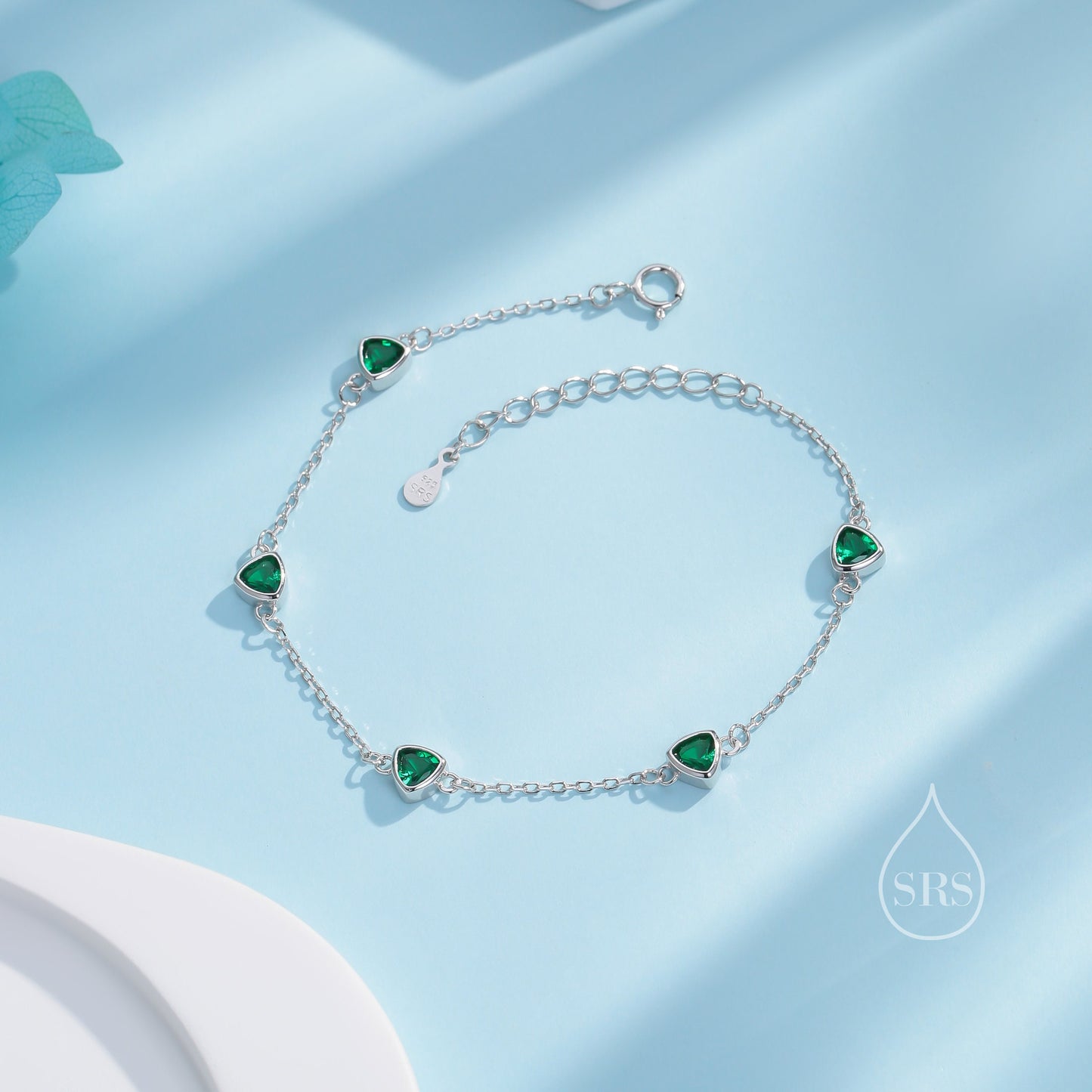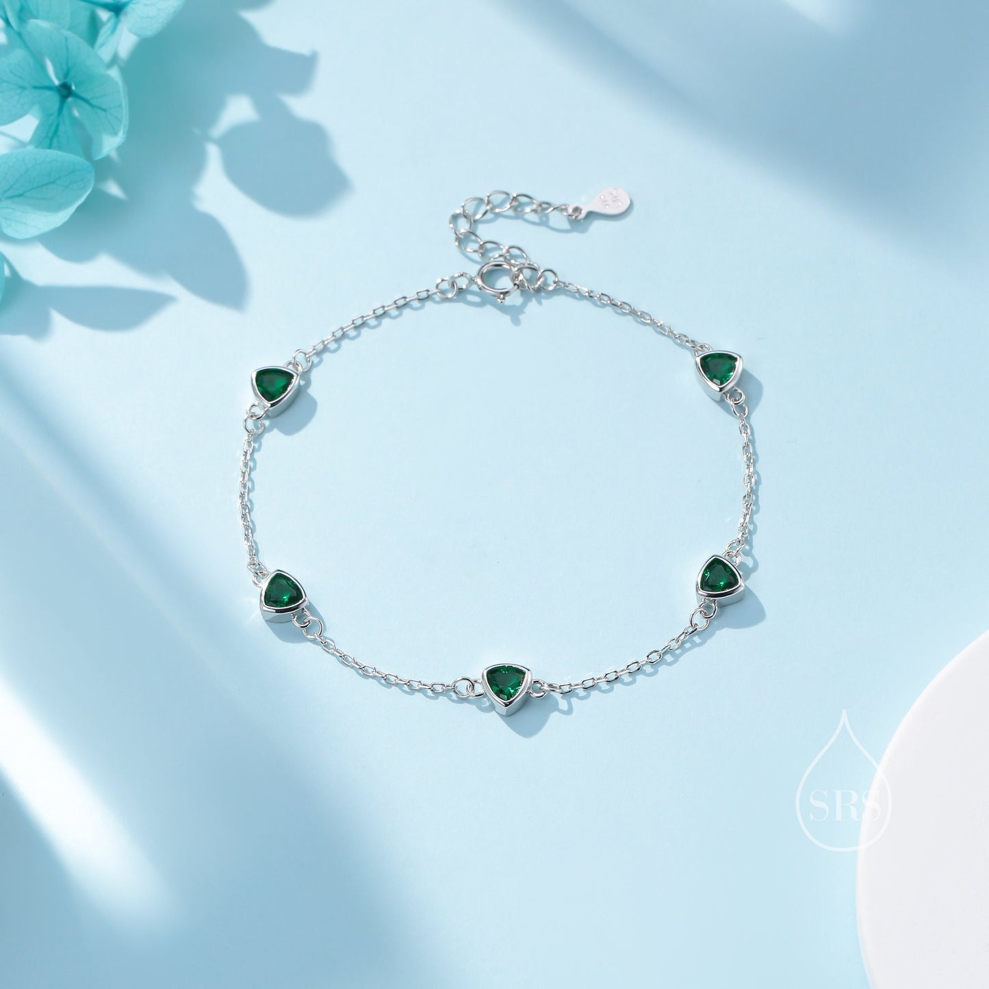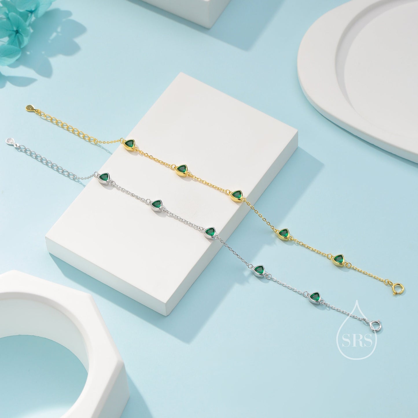 Sterling Silver Trillion Cut Emerald Green CZ Bezel Bracelet, Silver or Gold, CZ Satellite Bracelet, Tiny Delicate CZ Bracelet