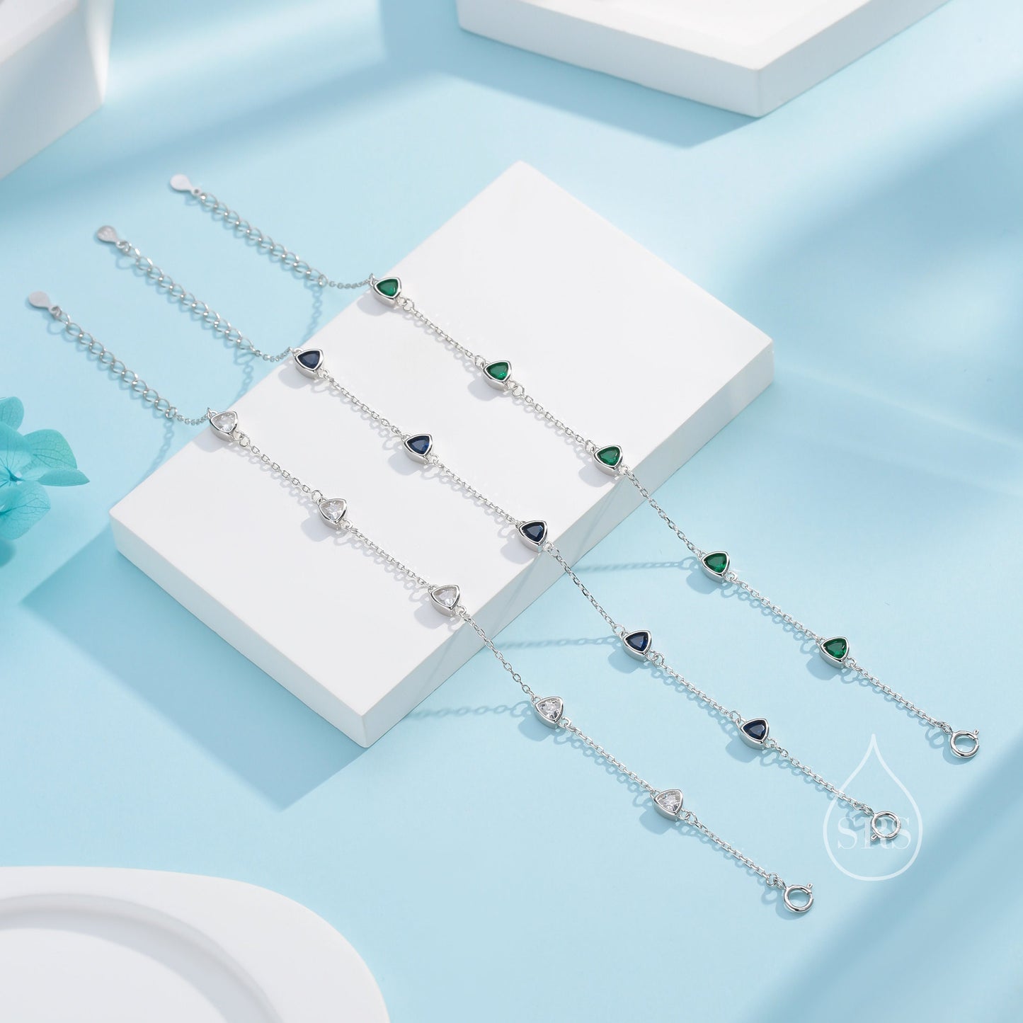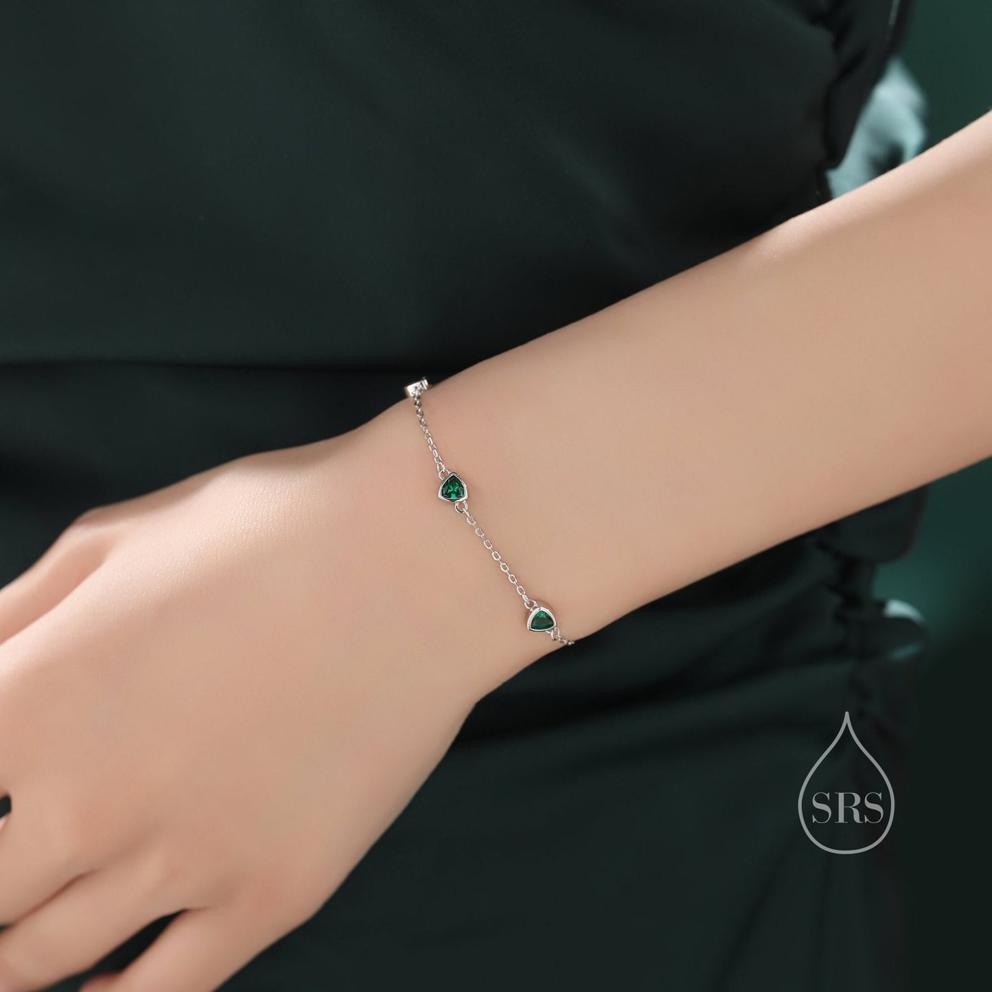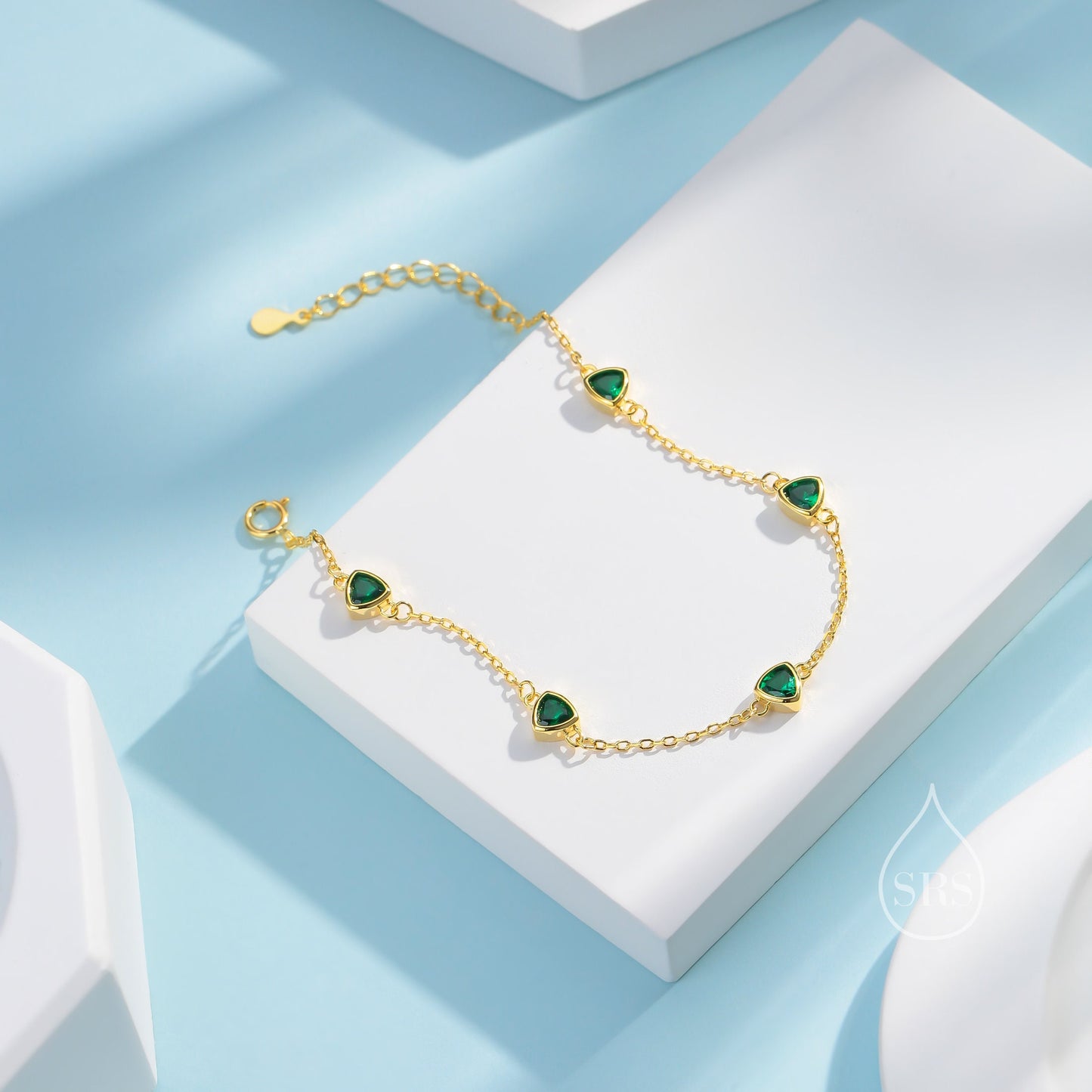 Sterling Silver Trillion Cut Emerald Green CZ Bezel Bracelet, Silver or Gold, CZ Satellite Bracelet, Tiny Delicate CZ Bracelet