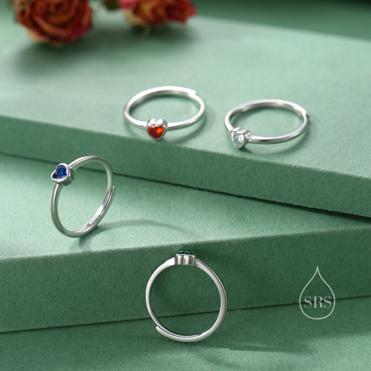 Sterling Silver Very Tiny Emerald Green CZ Heart Ring, Adjustable Size, Green Heart Ring, Tiny Heart Ring, Tiny Green CZ Heart Ring