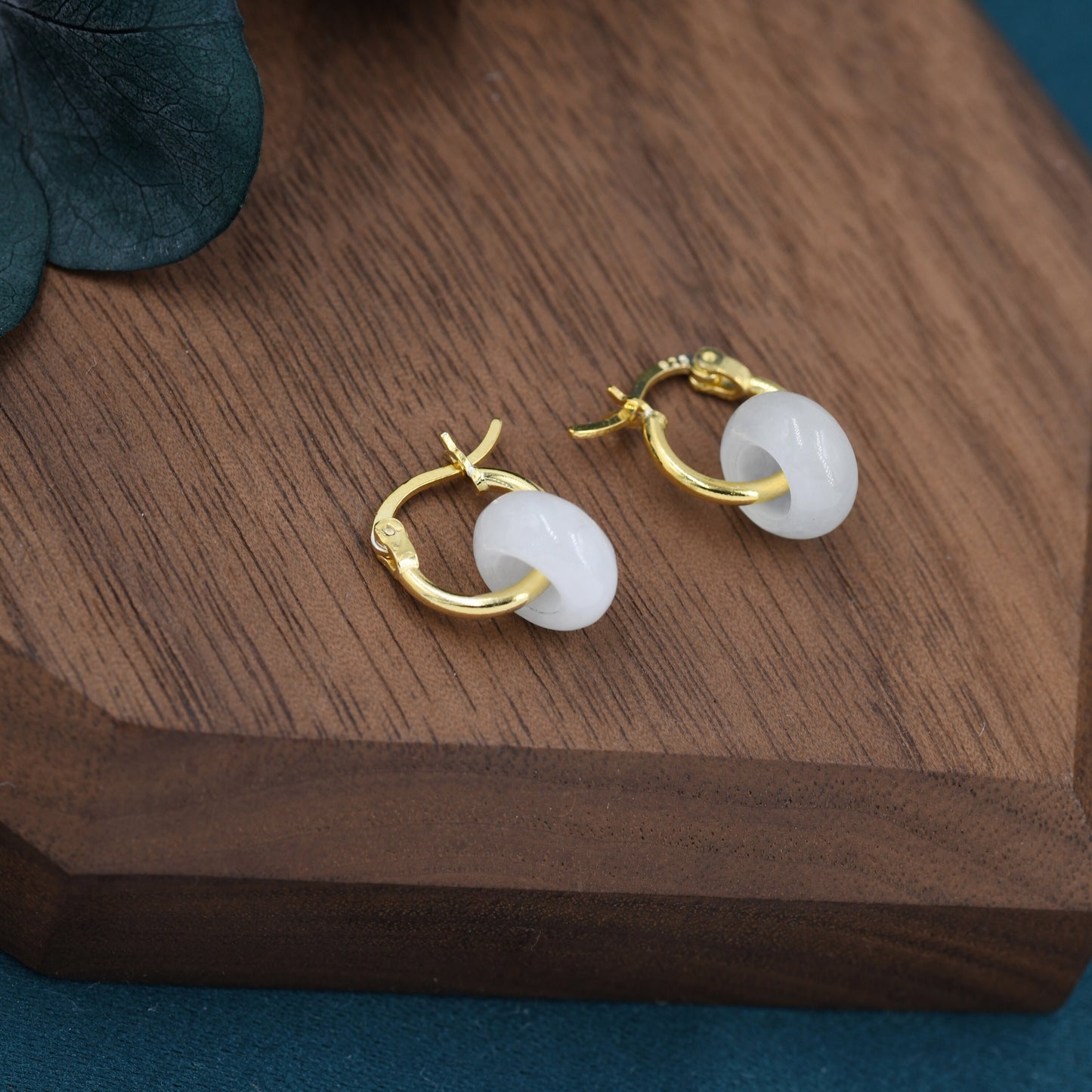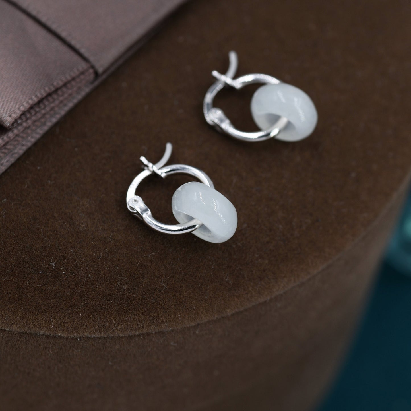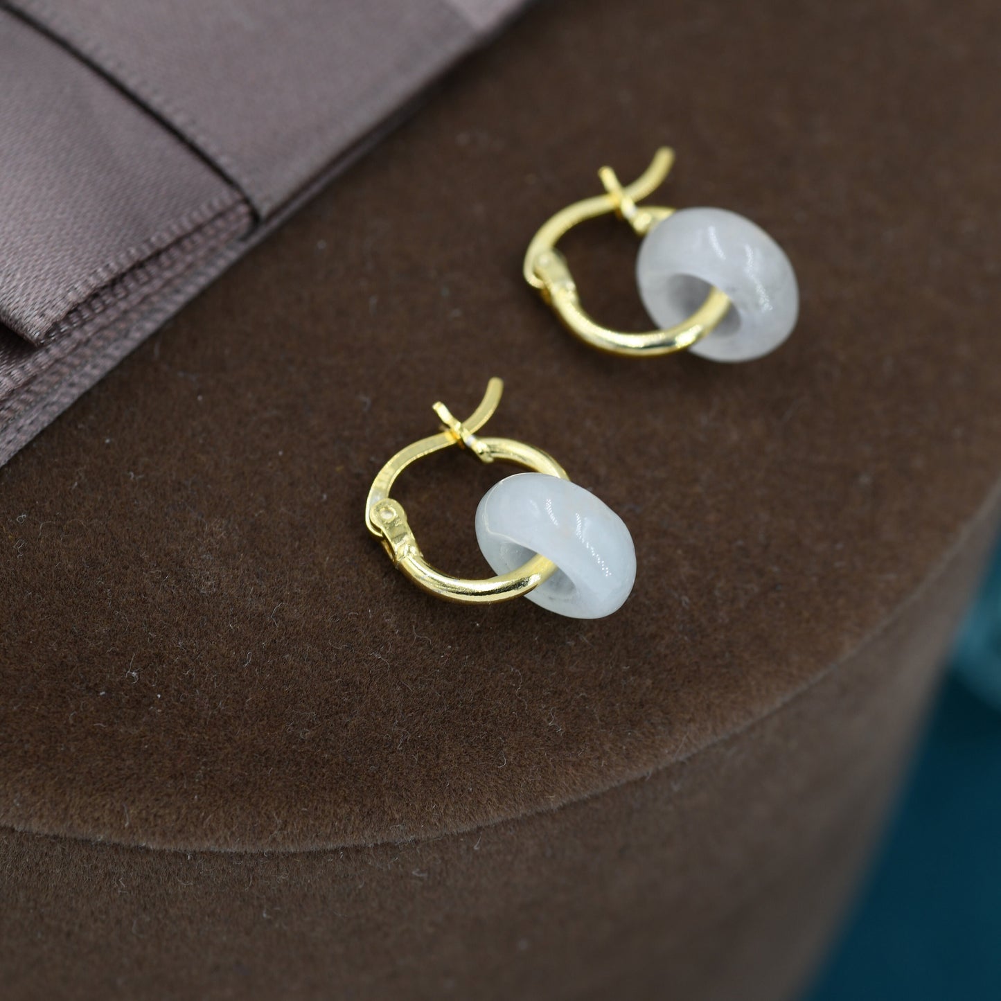 Sterling Silver White Jade Donut Huggie Hoop Earrings, Detachable Natural White Jade Coin Charm Dangle Hoop Earrings, Silver or Gold