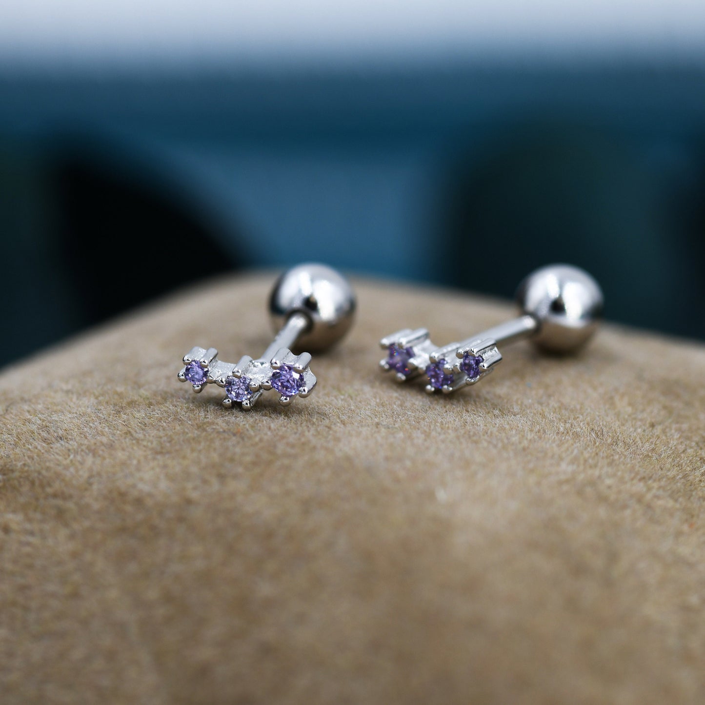 Tiny Amethyst Purple CZ Trio Screw Back Earrings in Sterling Silver, Silver or Gold, Tiny Three Star CZ Barbell Earrings, Stacking Earrings