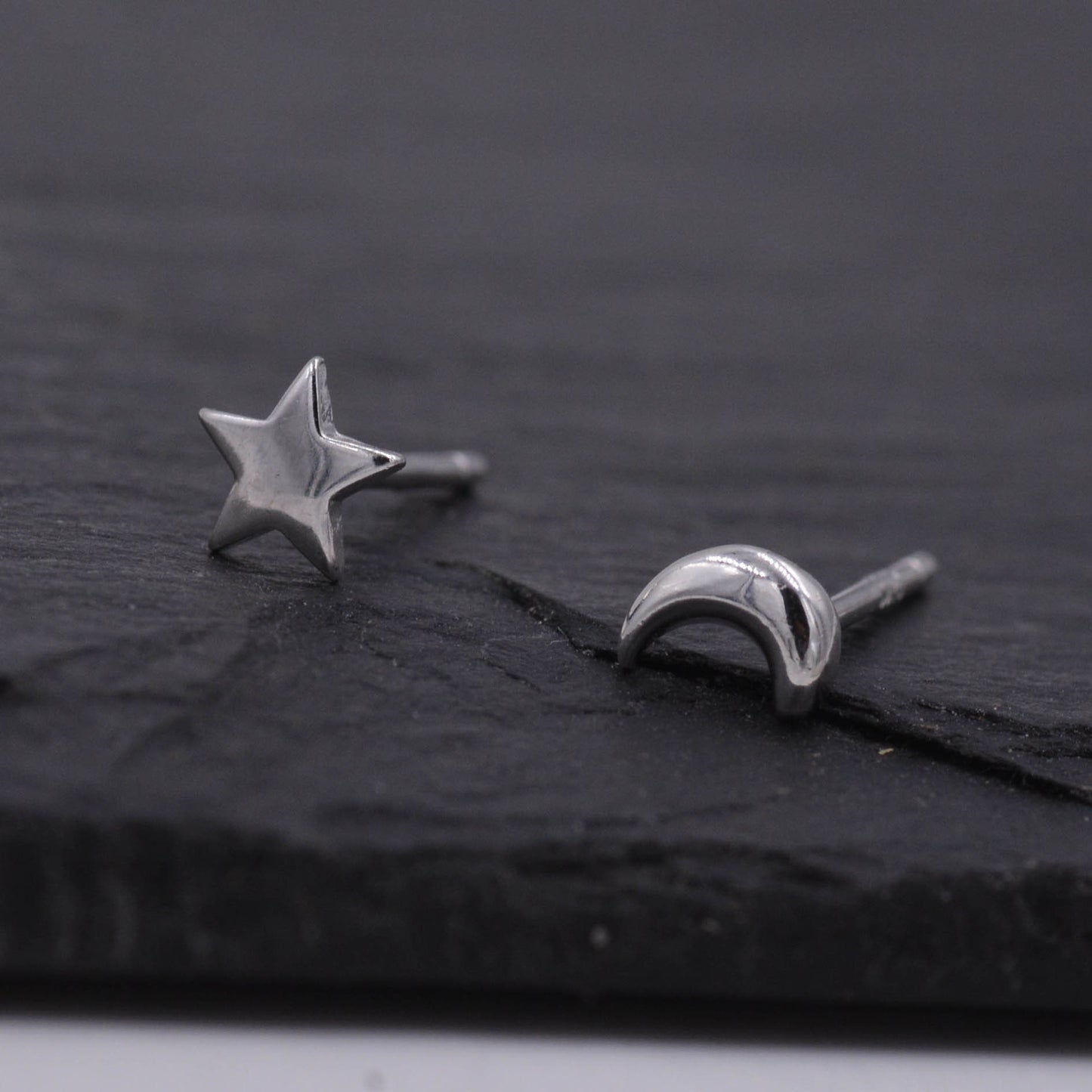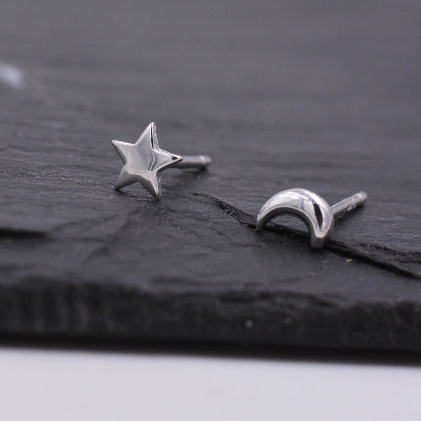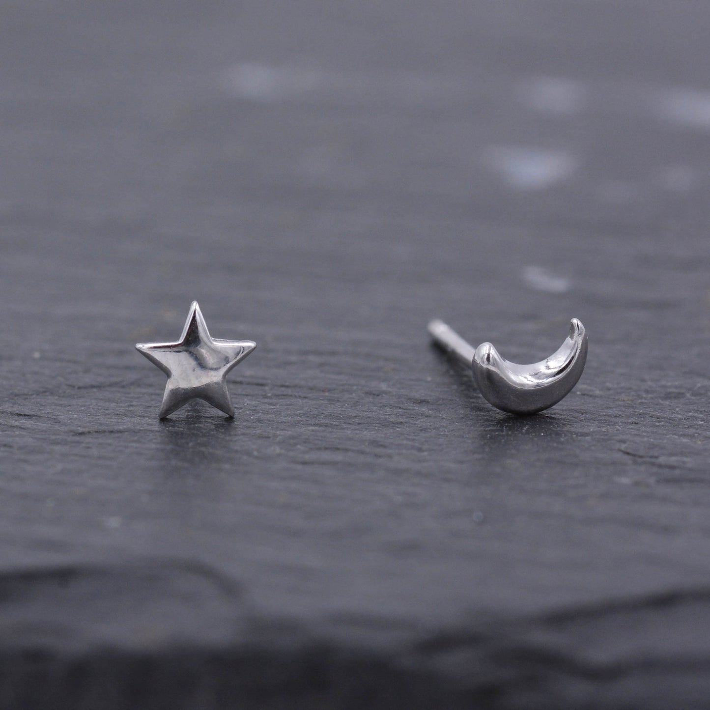 Tiny Crescent Moon and Star Mismatched Asymmetric Stud Earrings in Sterling Silver, Cute Fun and Quirky