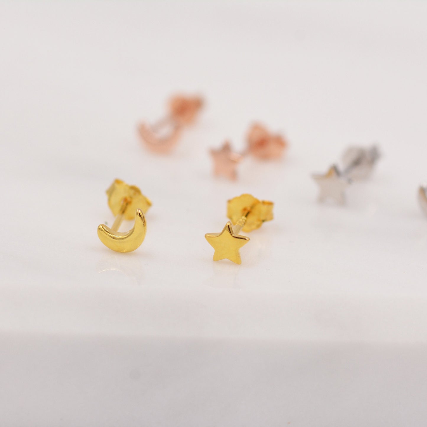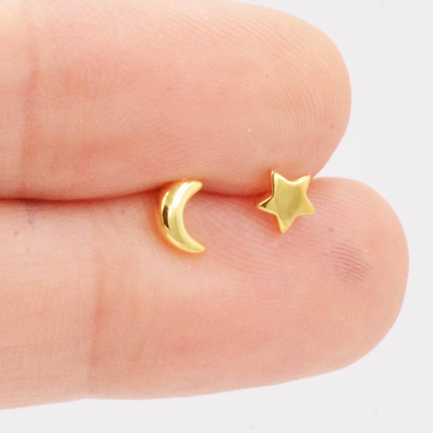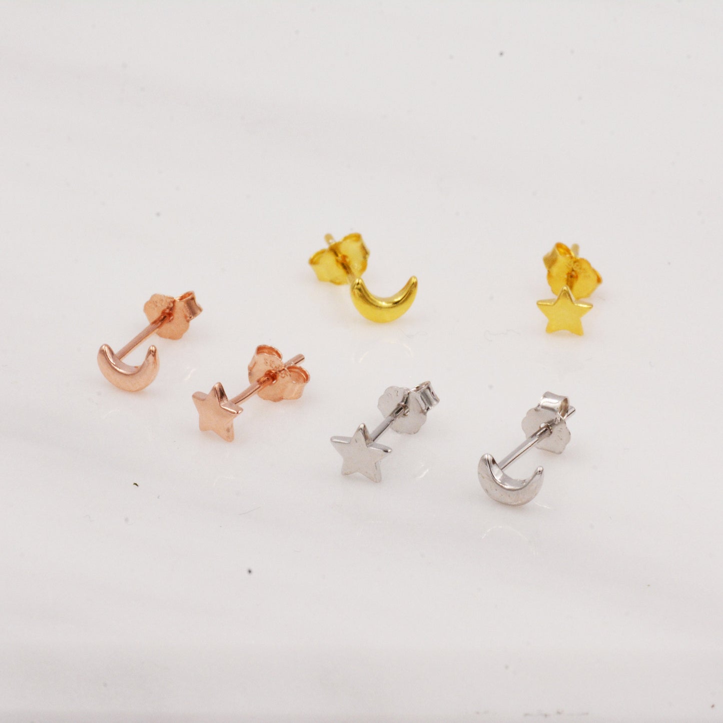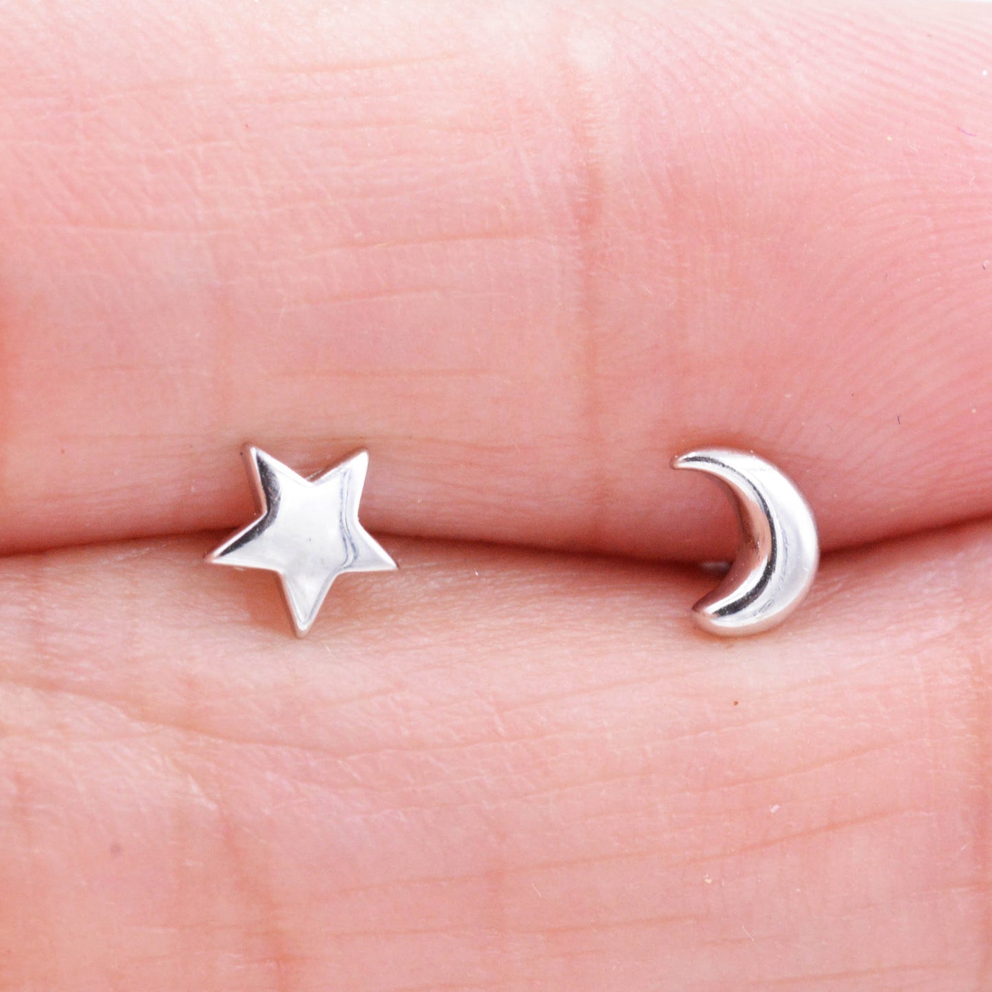 Tiny Crescent Moon and Star Mismatched Asymmetric Stud Earrings in Sterling Silver, Cute Fun and Quirky