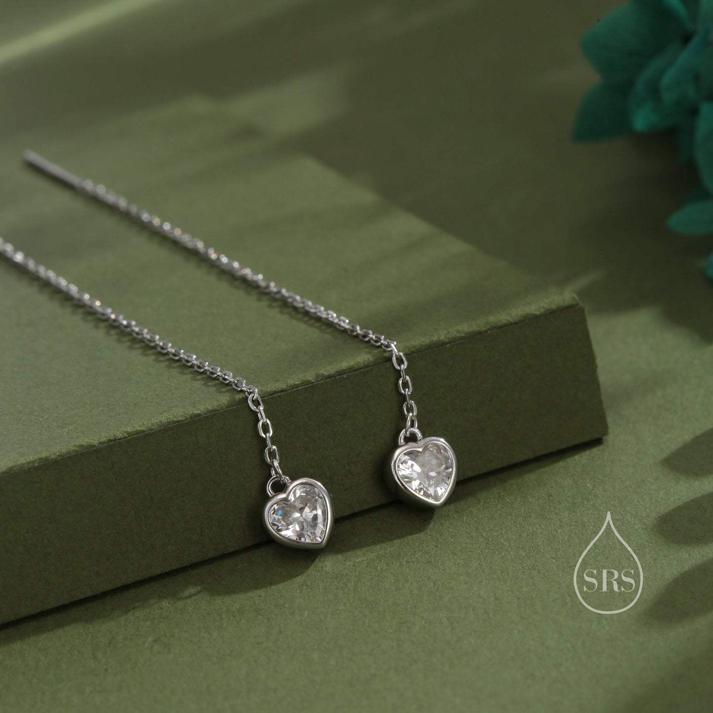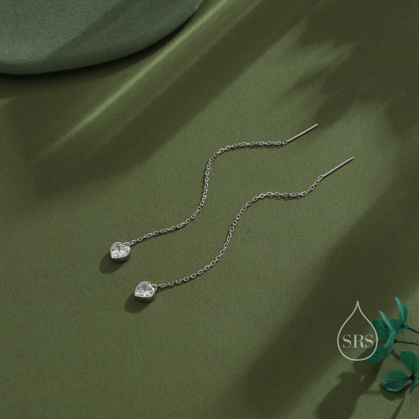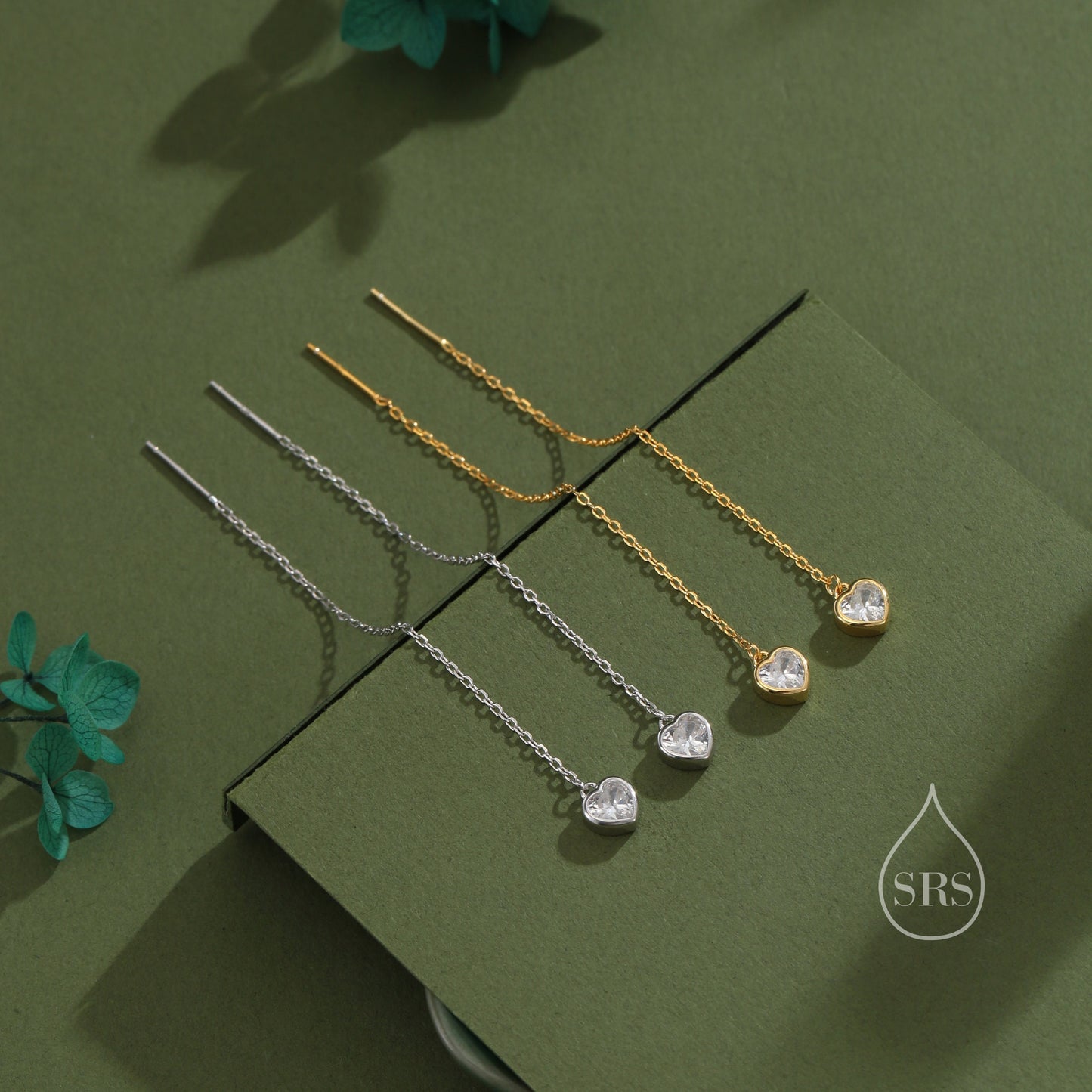 Tiny CZ Heart Threader Earrings in Sterling Silver, 9cm, Silver or Gold, Dainty Heart Ear Threaders, Delicate Heart Threaders