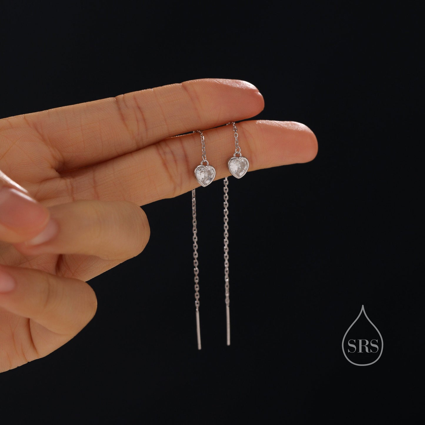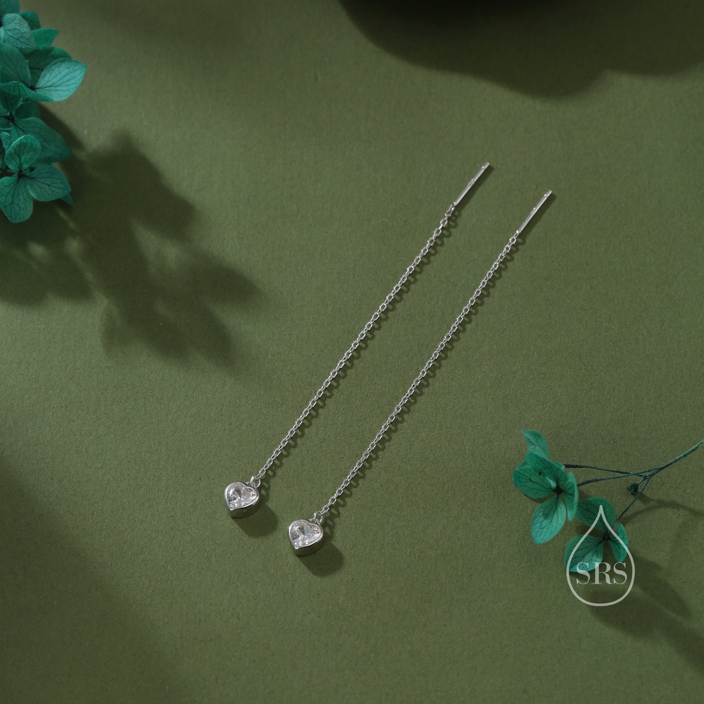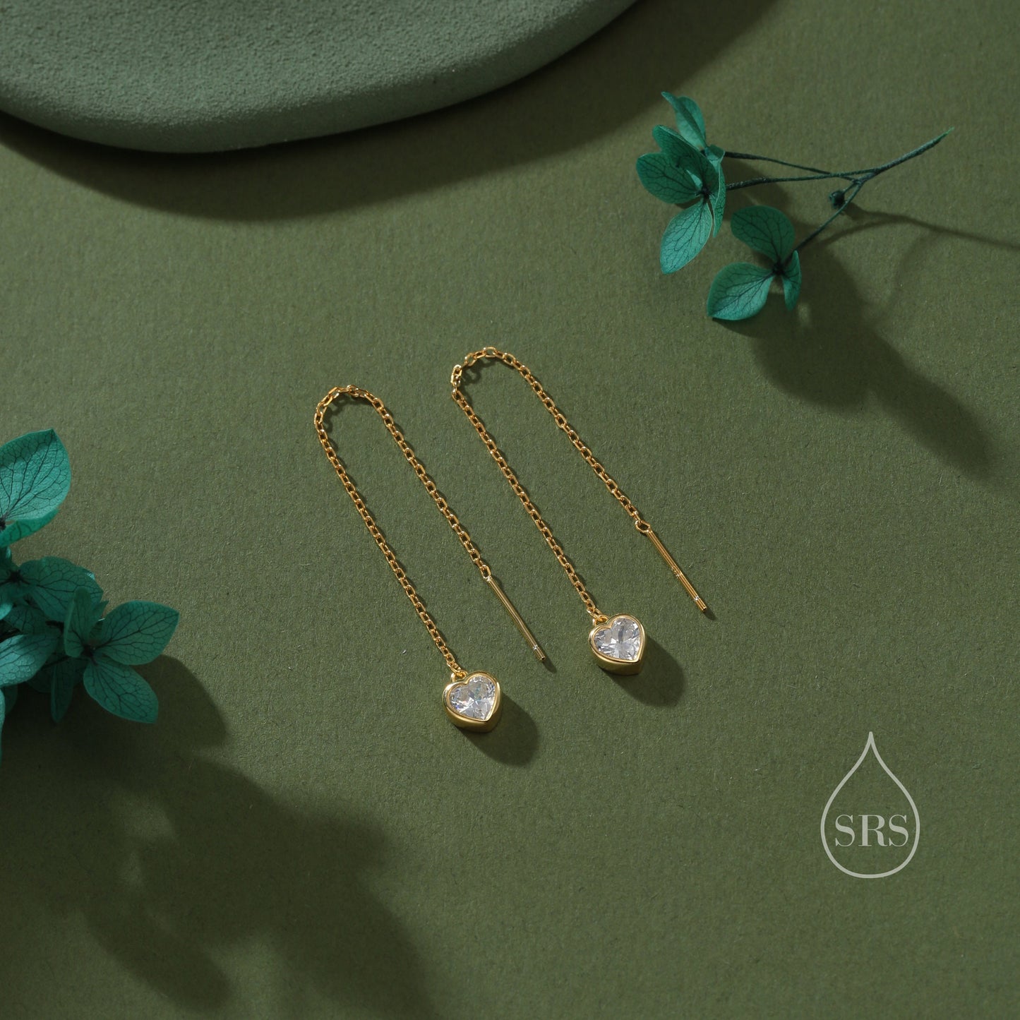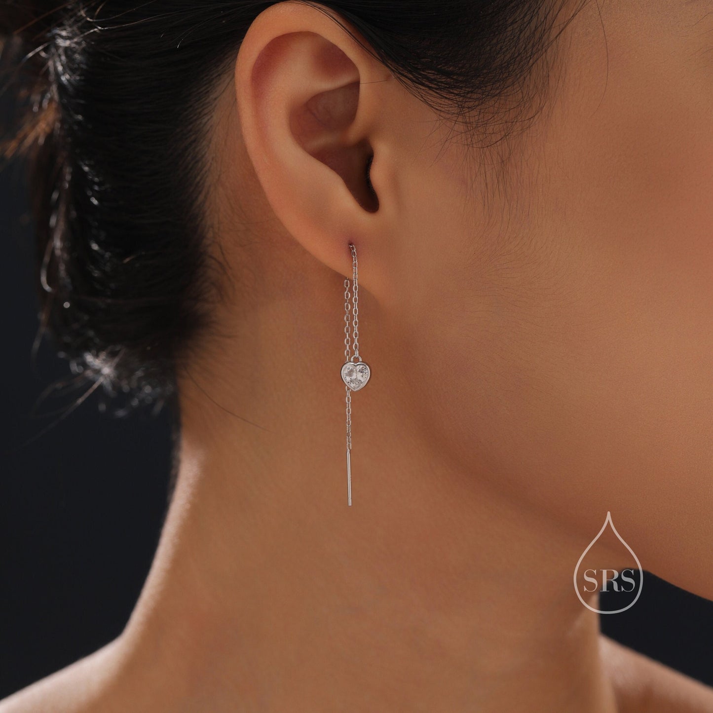 Tiny CZ Heart Threader Earrings in Sterling Silver, 9cm, Silver or Gold, Dainty Heart Ear Threaders, Delicate Heart Threaders