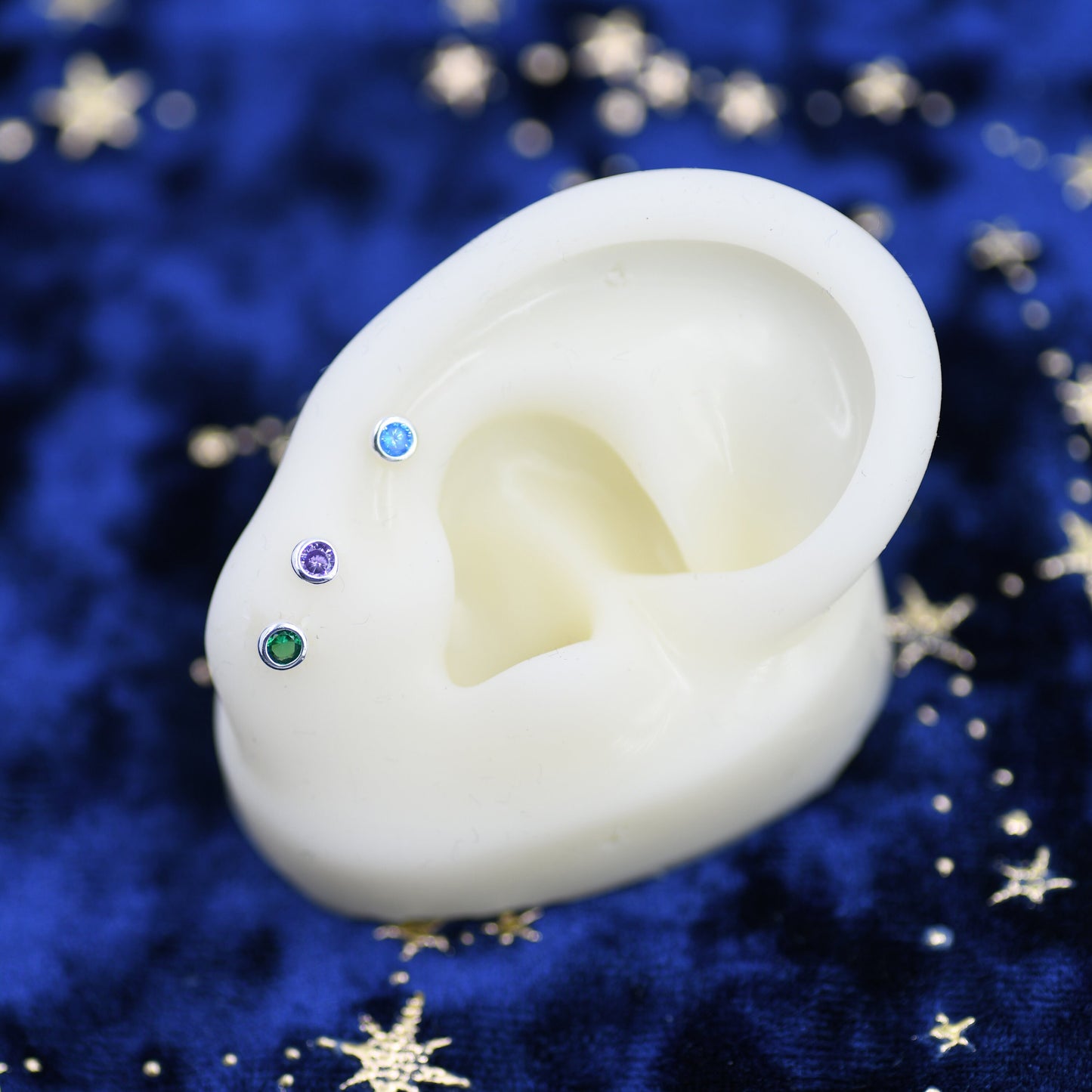 Tiny Emerald Green CZ Barbell Earrings in Sterling Silver, 3mm CZ Screw Back Dot Earrings, Screwback Earrings, May Birthstone
