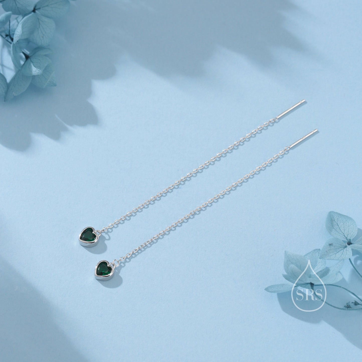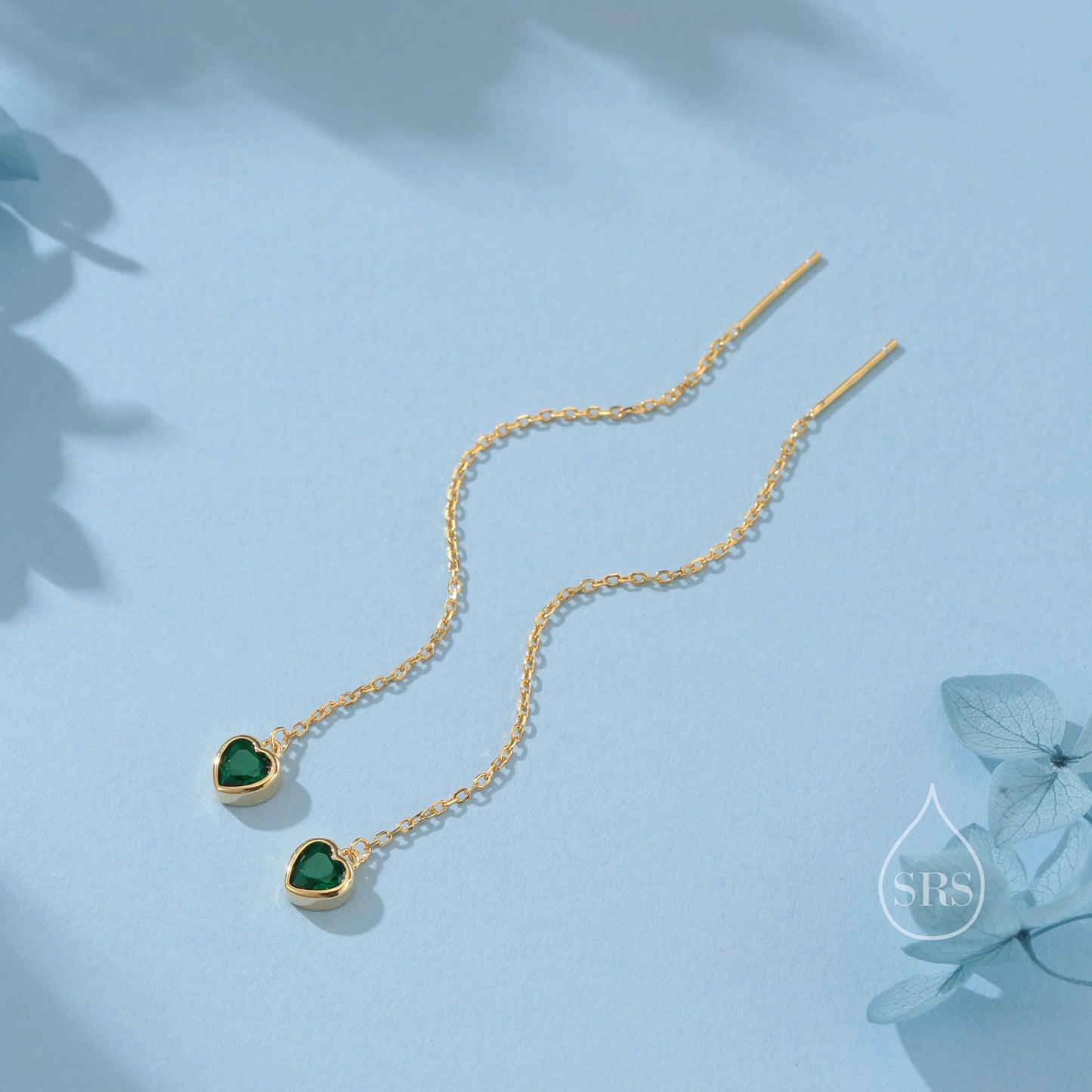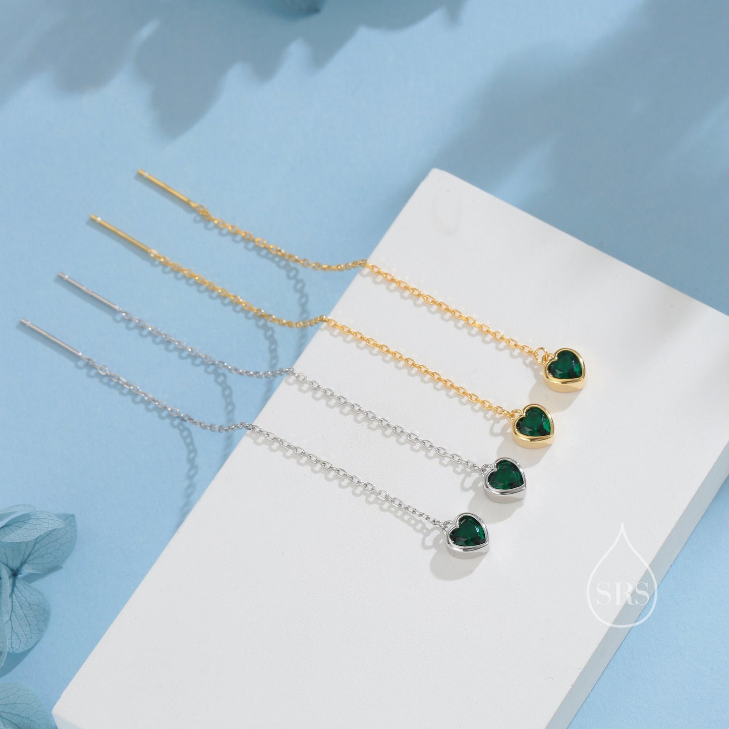 Tiny Emerald Green CZ Heart Threader Earrings in Sterling Silver, 9cm, Silver or Gold , Dainty Heart Ear Threaders, Delicate Heart Threaders