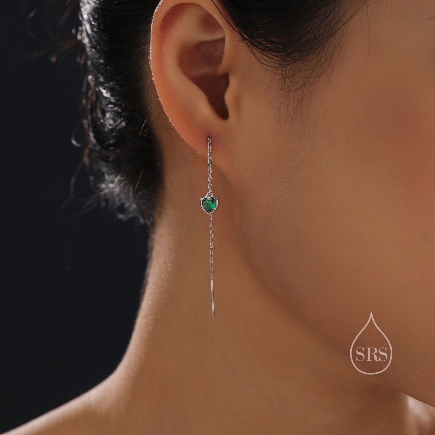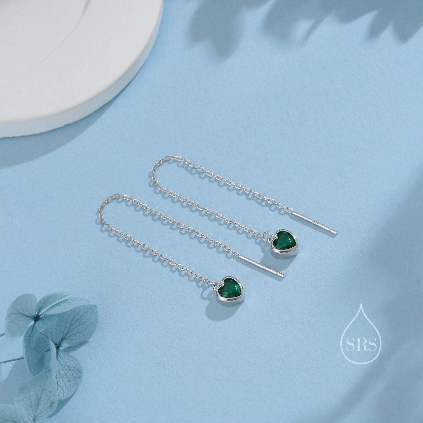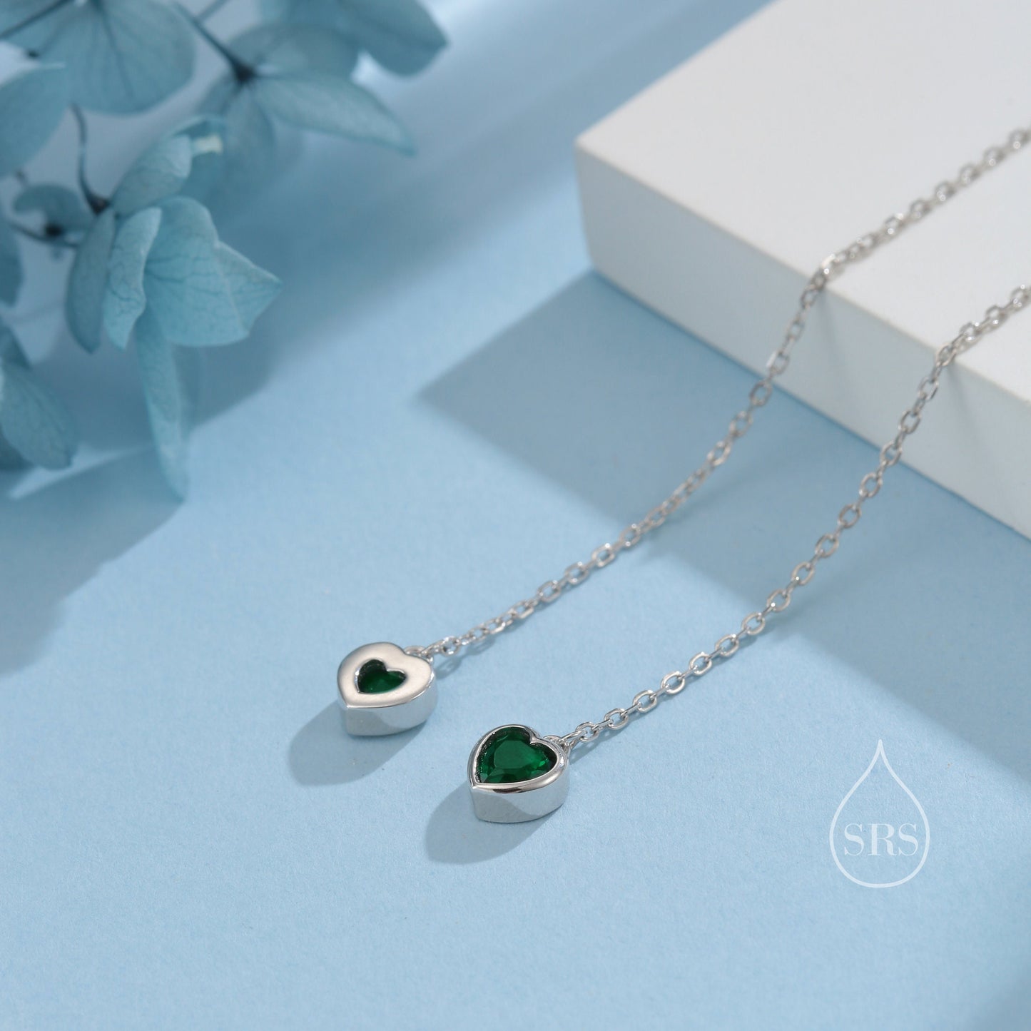 Tiny Emerald Green CZ Heart Threader Earrings in Sterling Silver, 9cm, Silver or Gold , Dainty Heart Ear Threaders, Delicate Heart Threaders