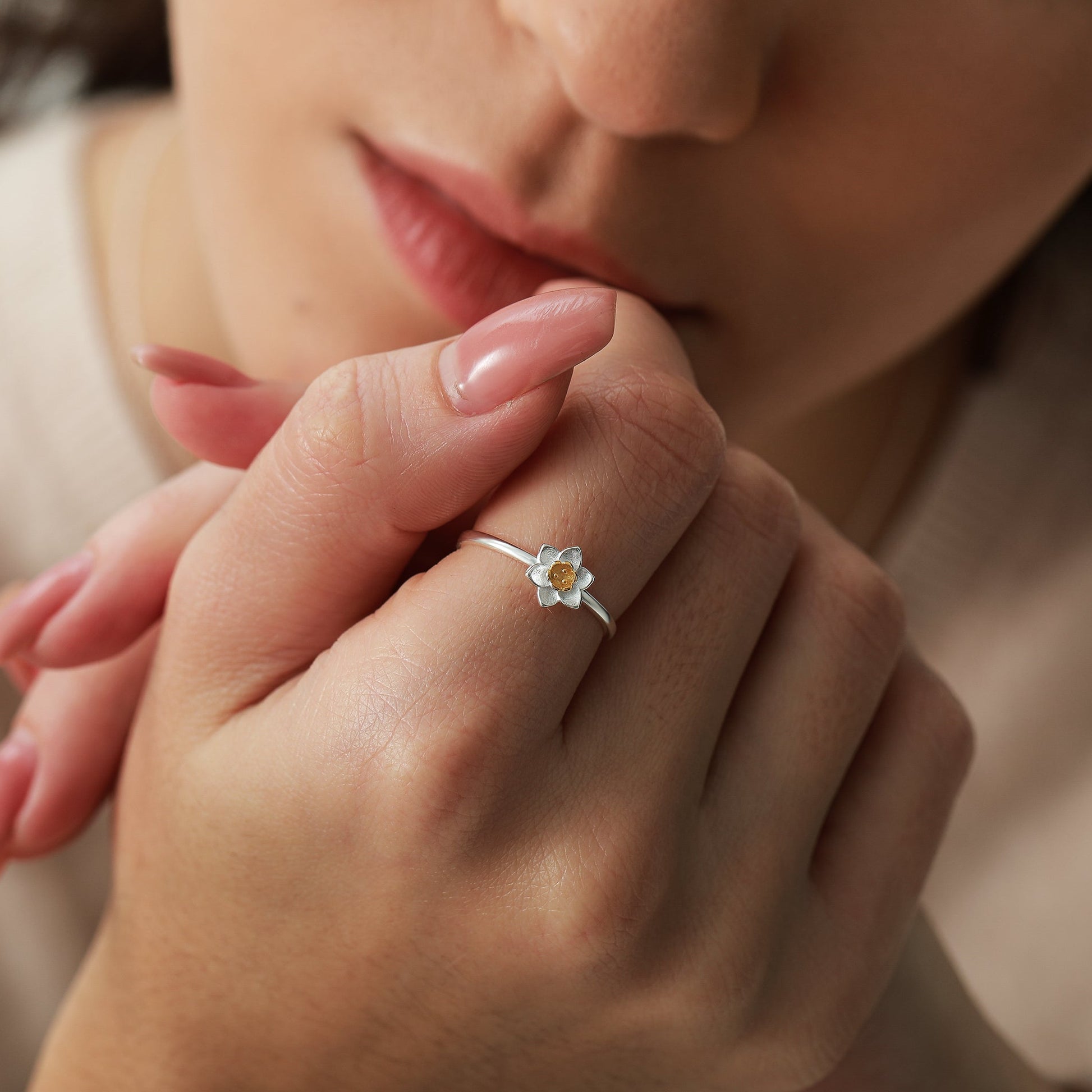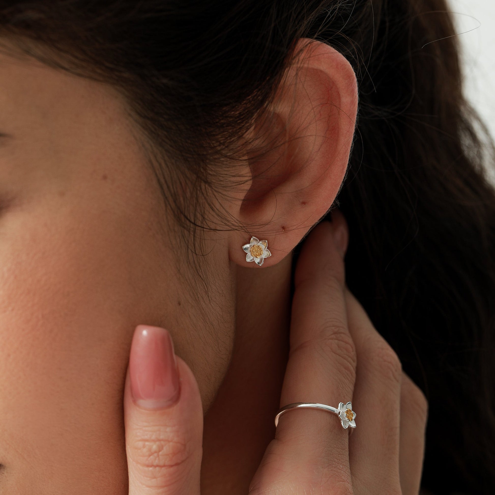 A delicate celebration of spring, this tiny daffodil jewellery piece features beautifully enamelled petals with 18ct gold-plated details at the centre, finished in sterling silver. Designed to be worn effortlessly every day, it’s light, charming, and quietly distinctive.