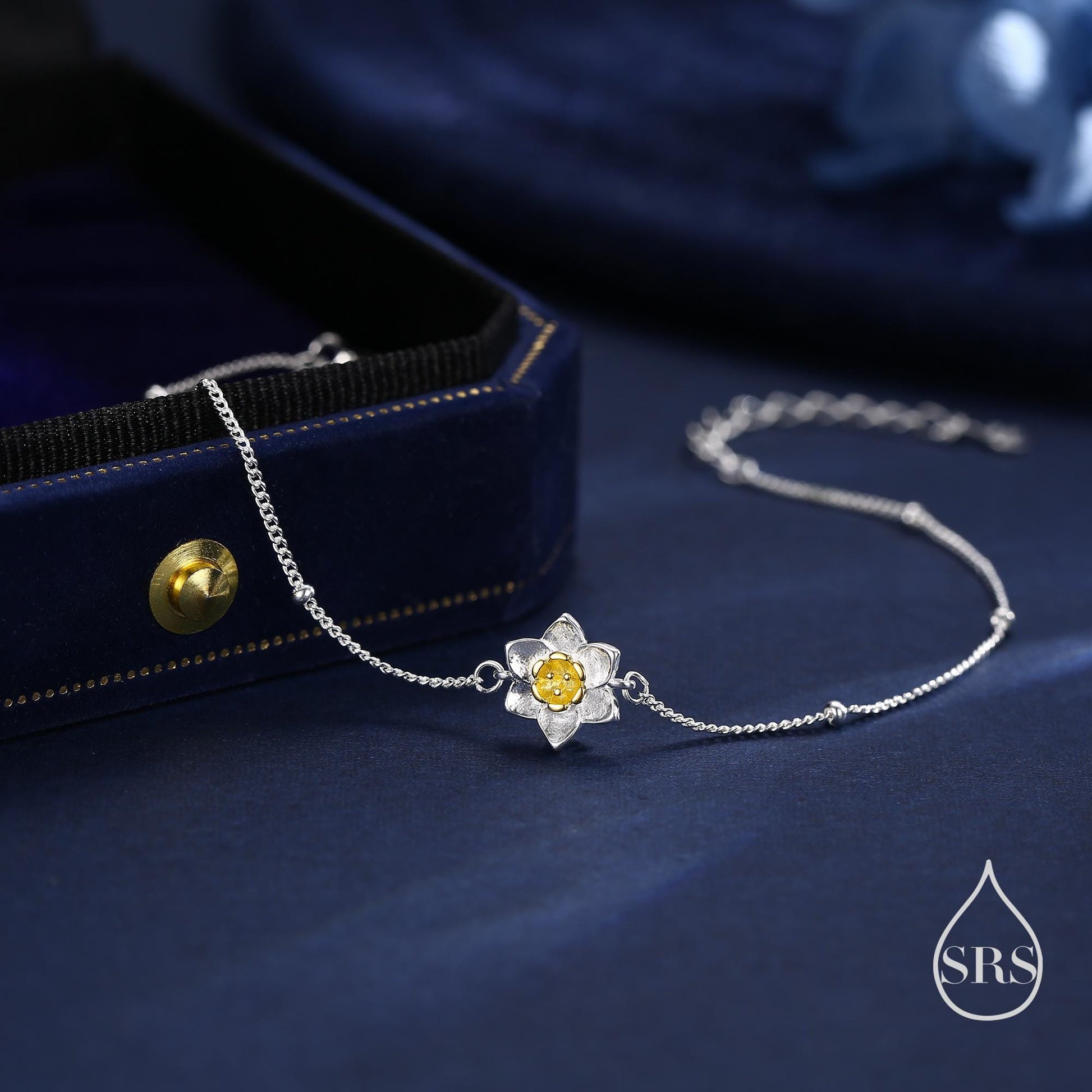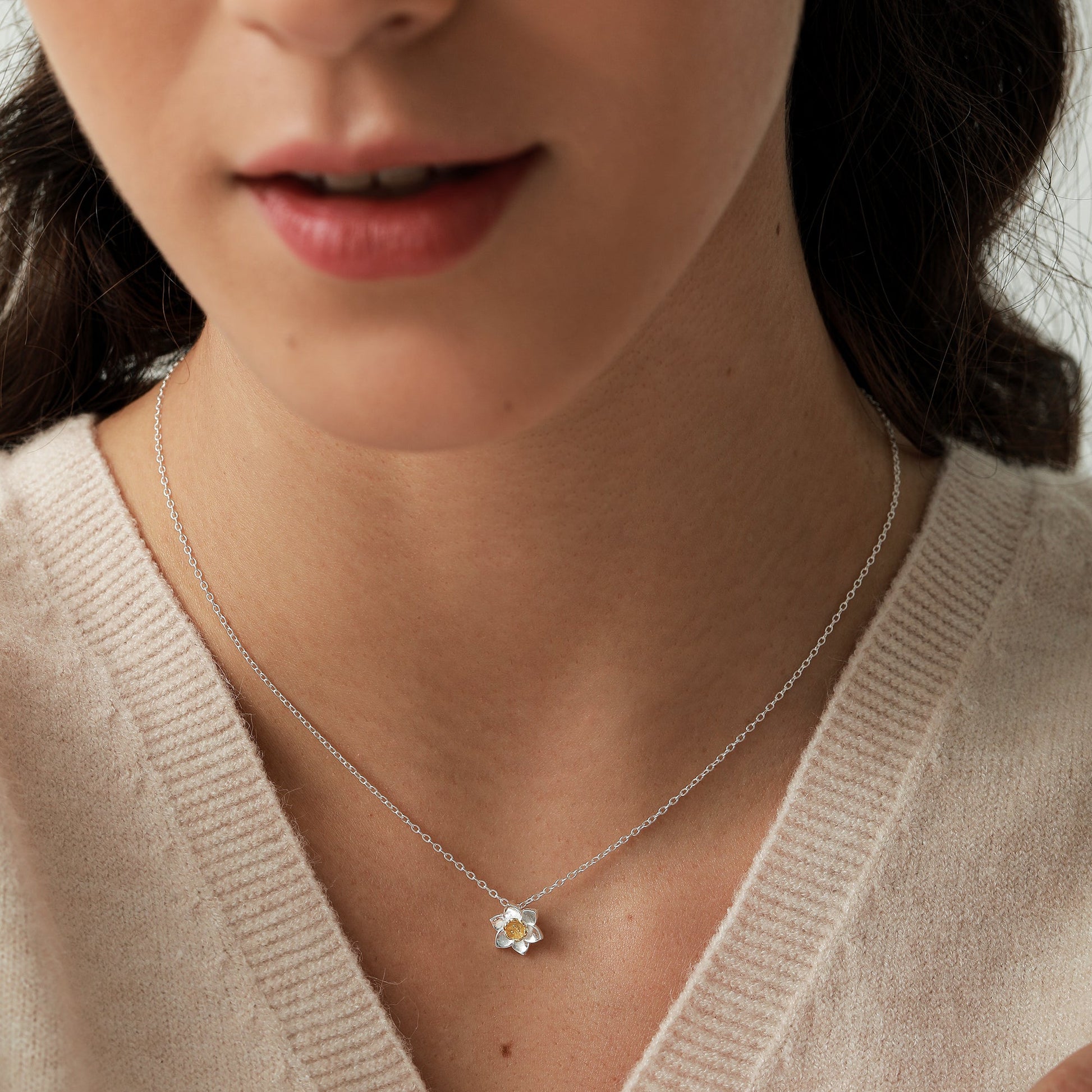 Daffodil Jewellery Set in Sterling Silver — Rhodium-Coated Earrings and Necklace with 18ct Gold-Plated Details