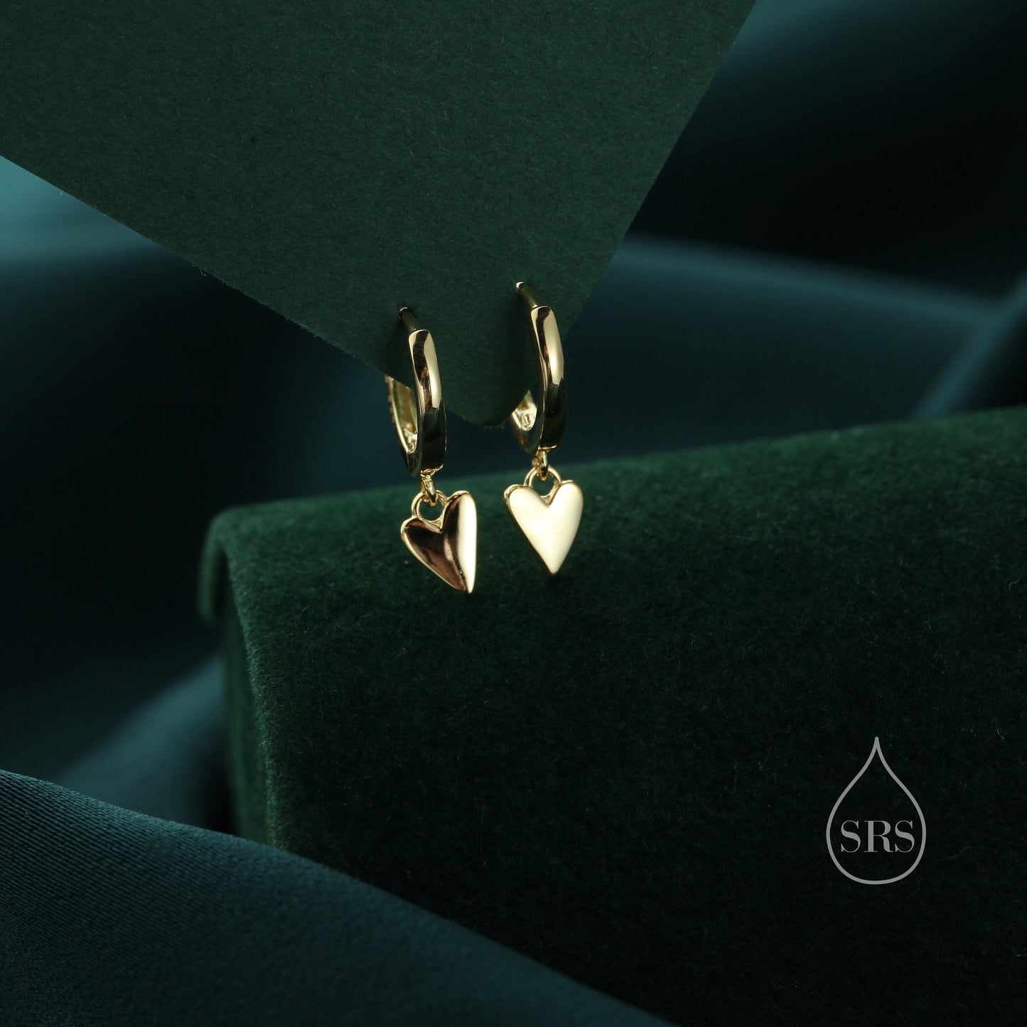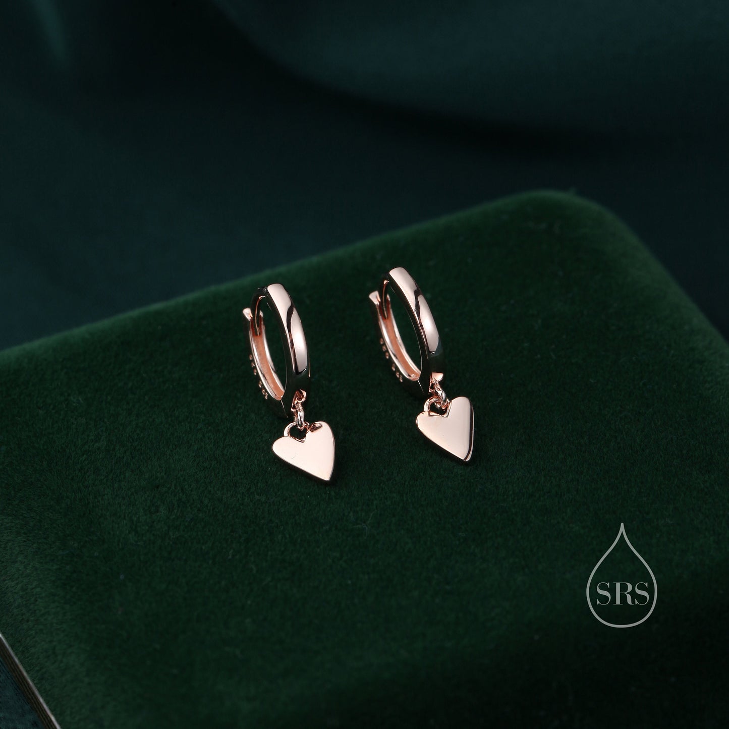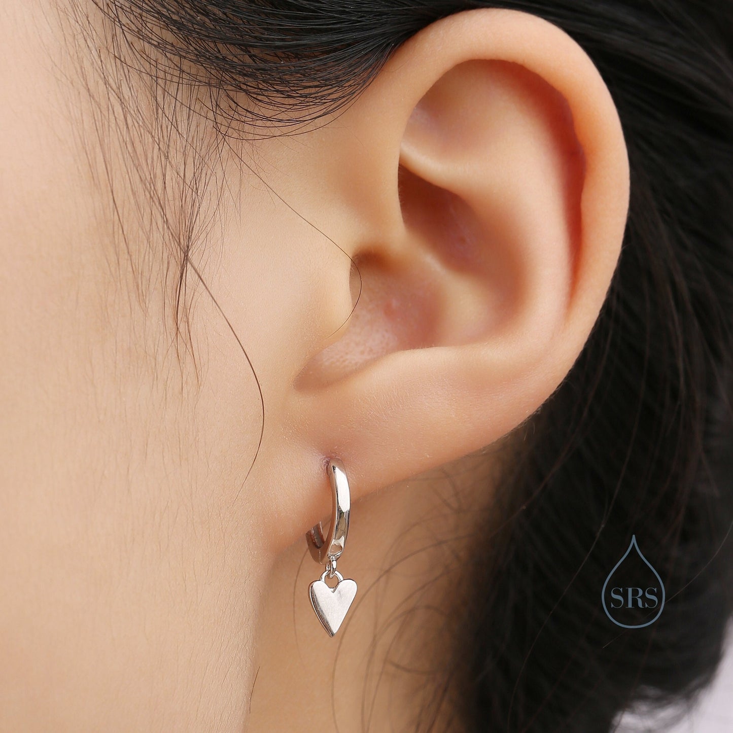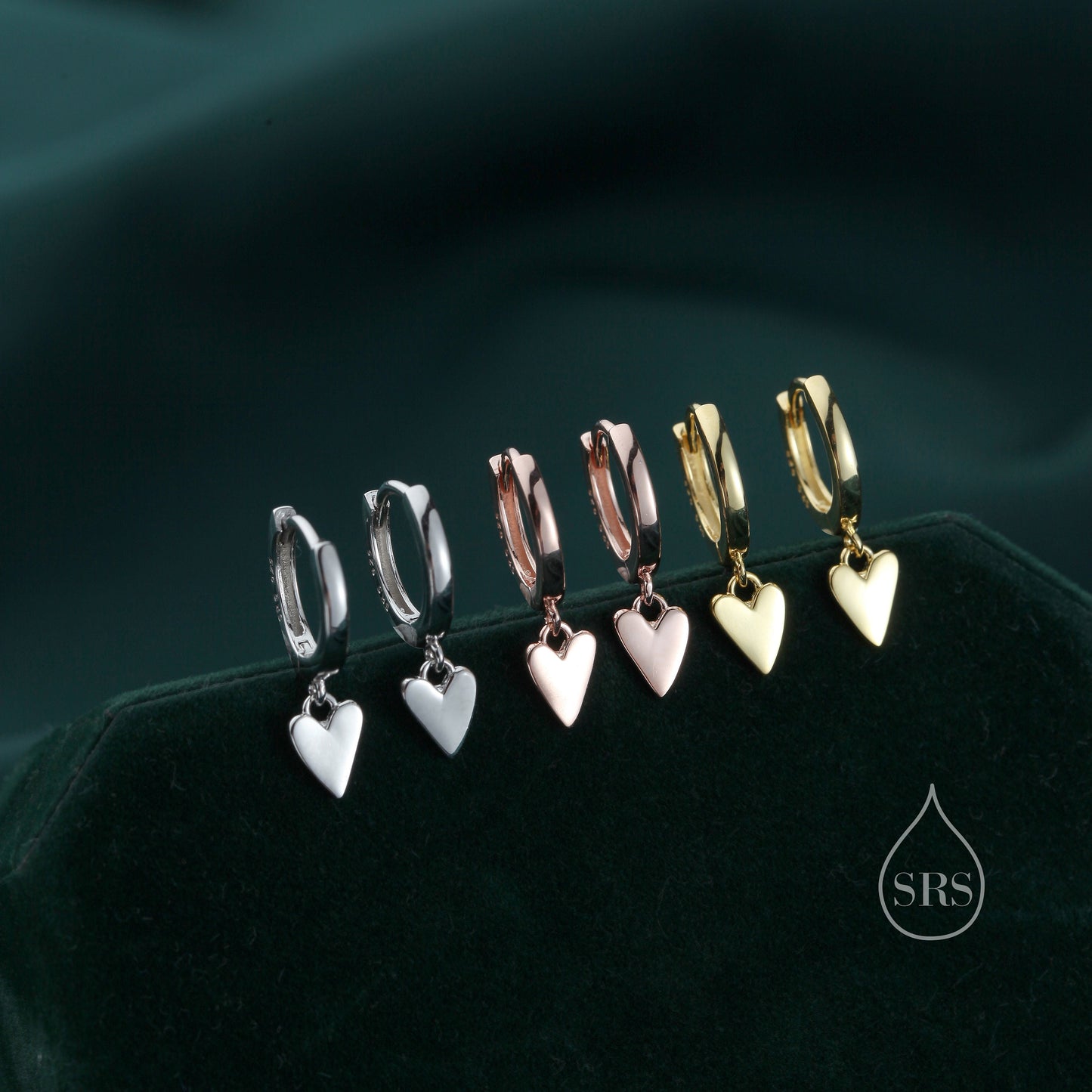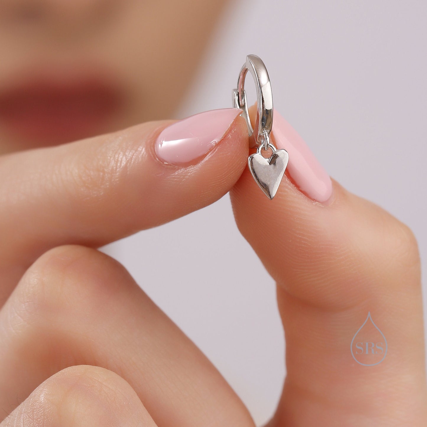 Tiny Heart Dangle Huggie Hoop in Sterling Silver, Silver or Gold or Rose Gold, Skinny Heart Earrings, Heart Huggie Hoops