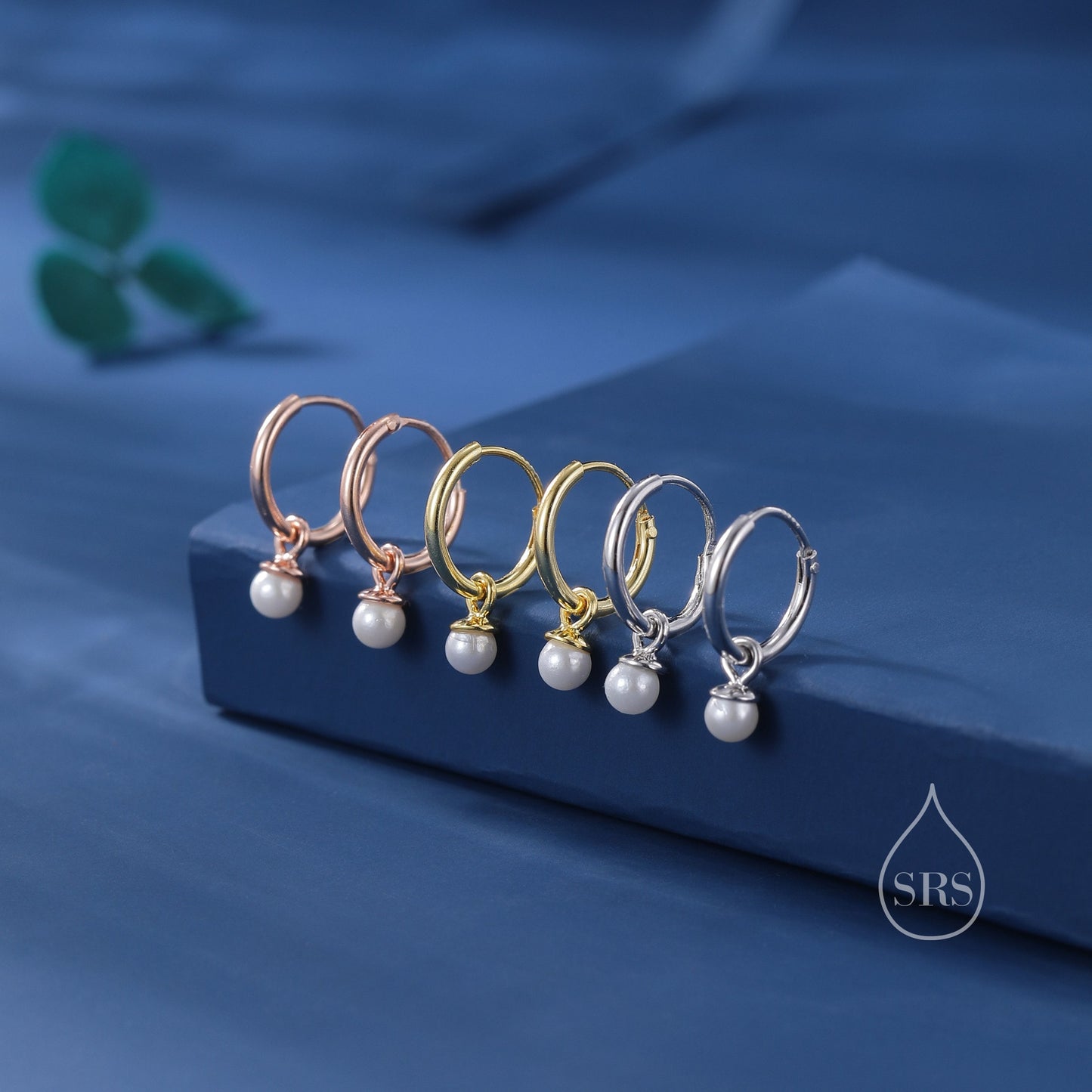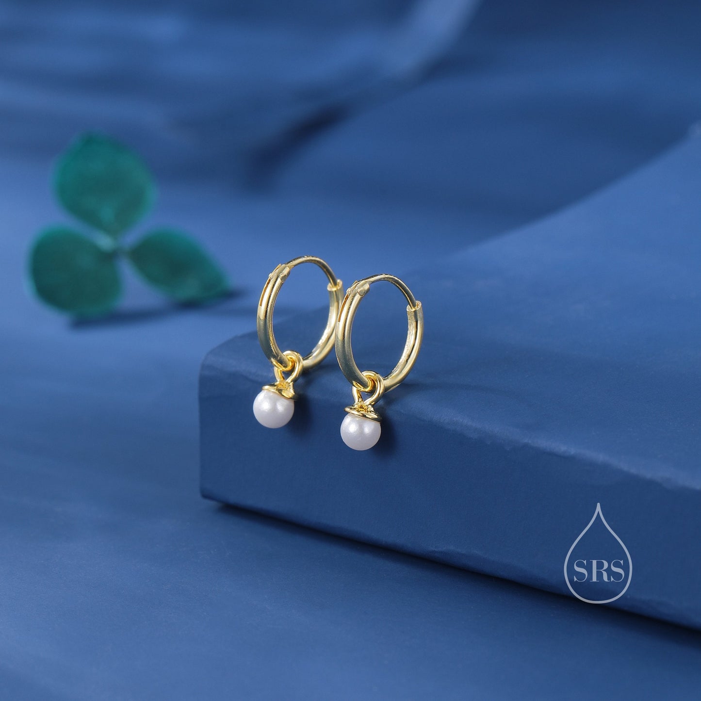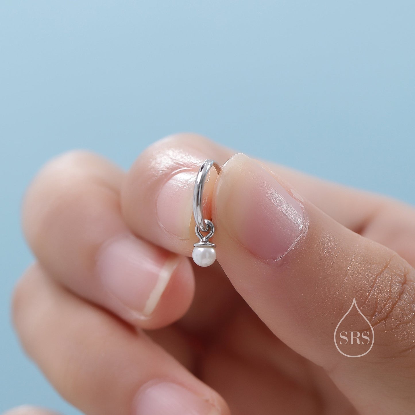 Tiny Mother of Pearl Huggie Hoop Earrings in Sterling Silver with Sleeper Hoops, 8mm Simple Pearl Dangle Earrings, Gold and Silver