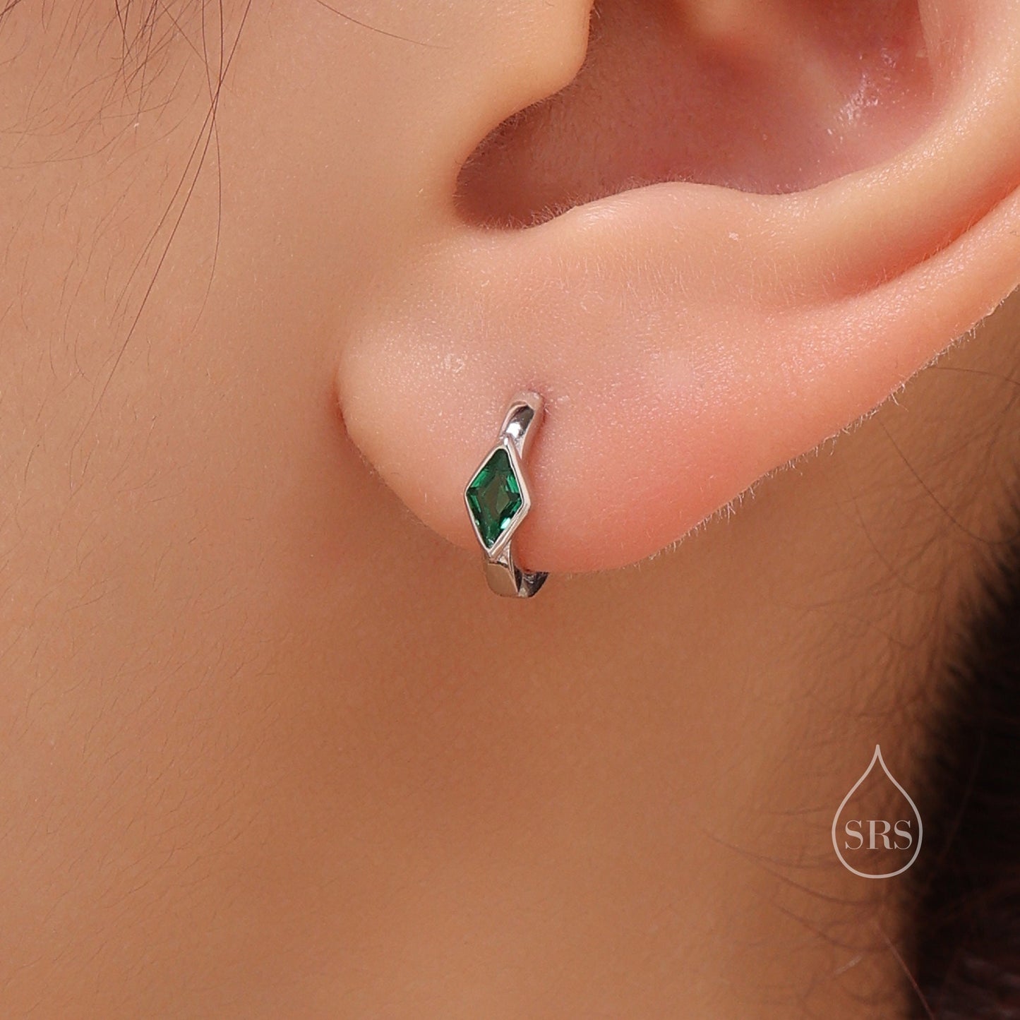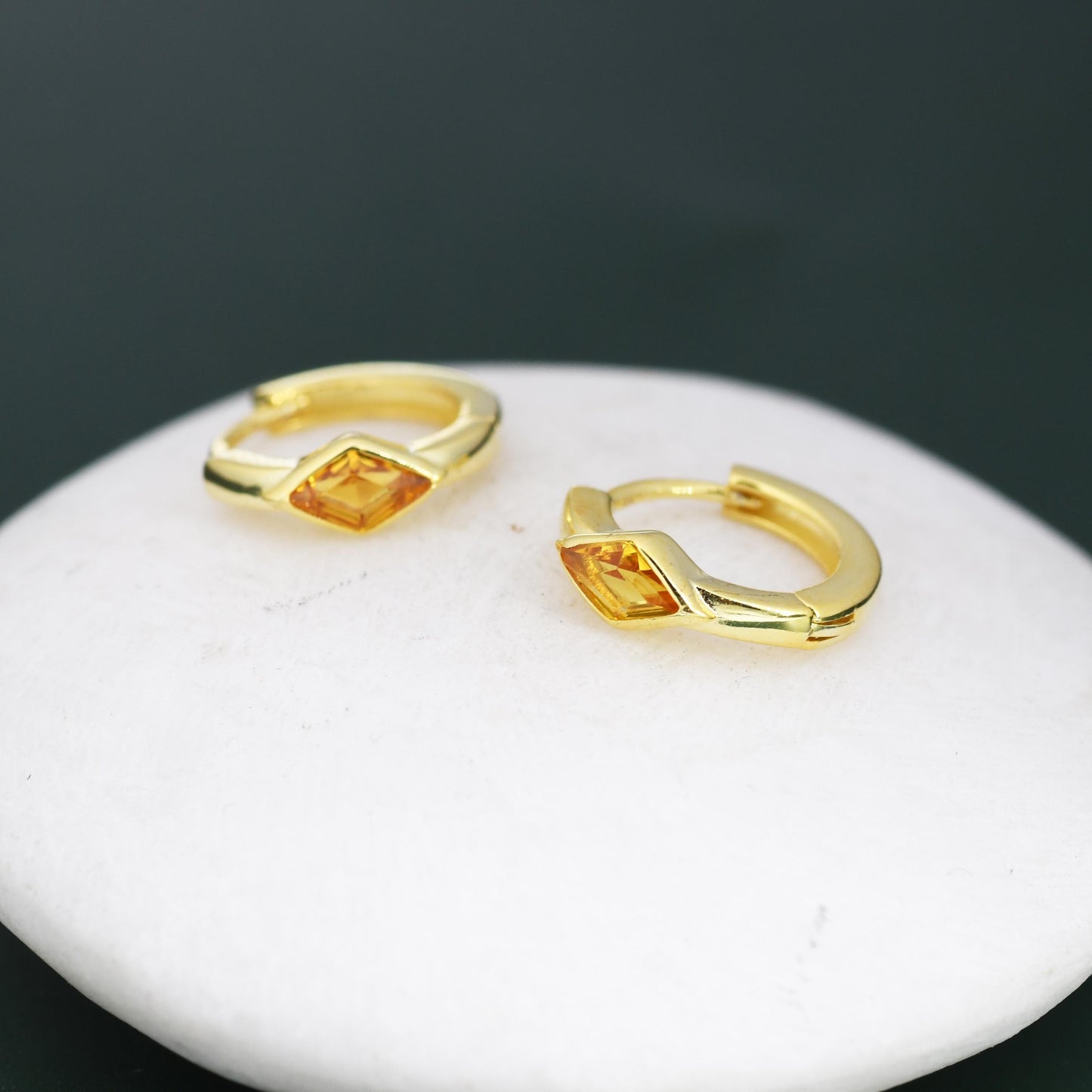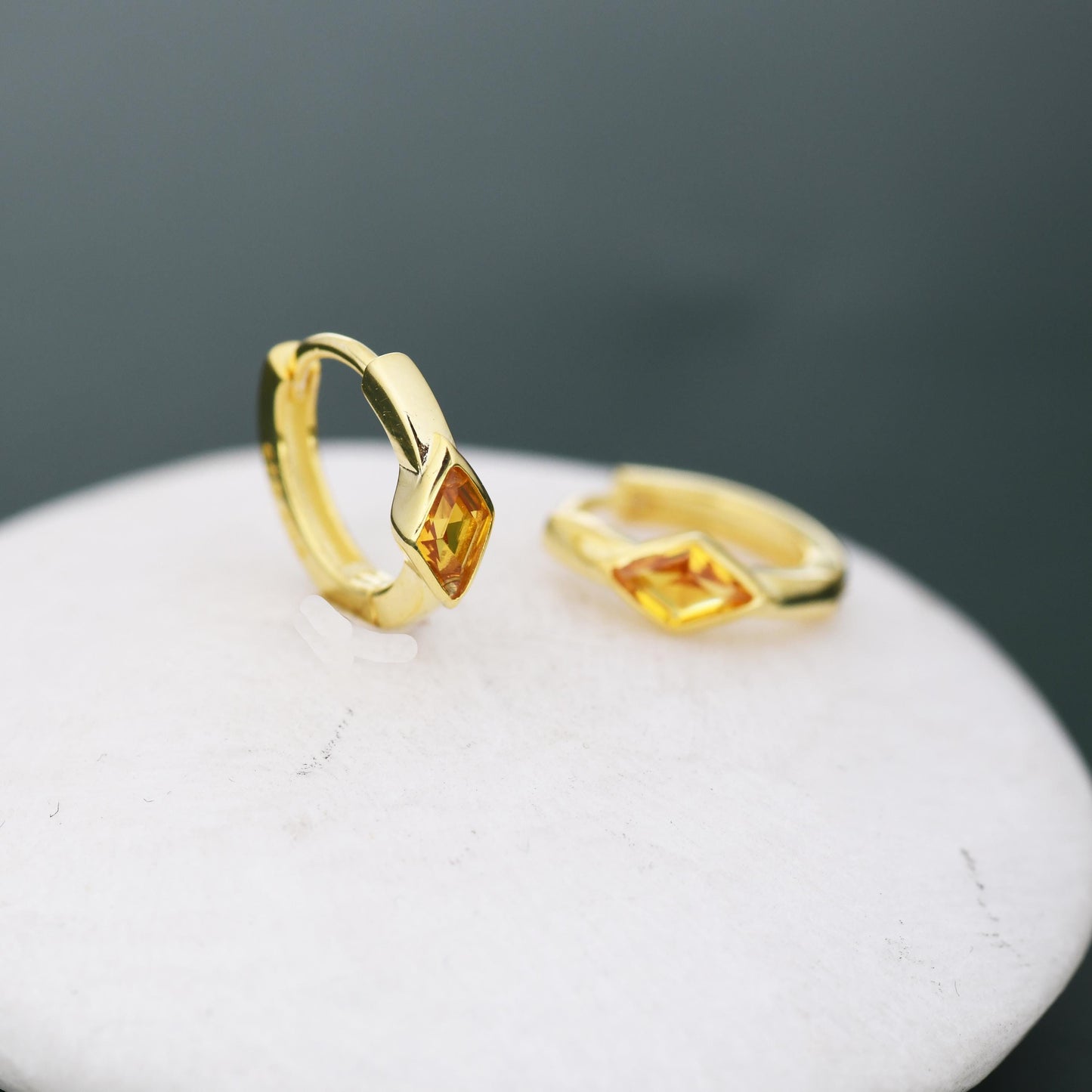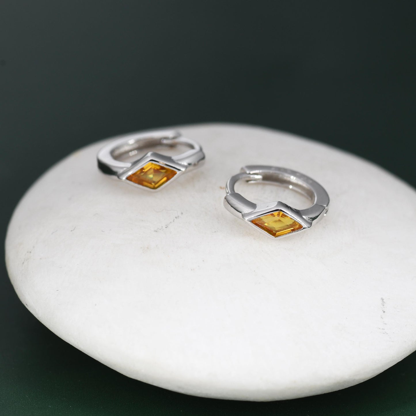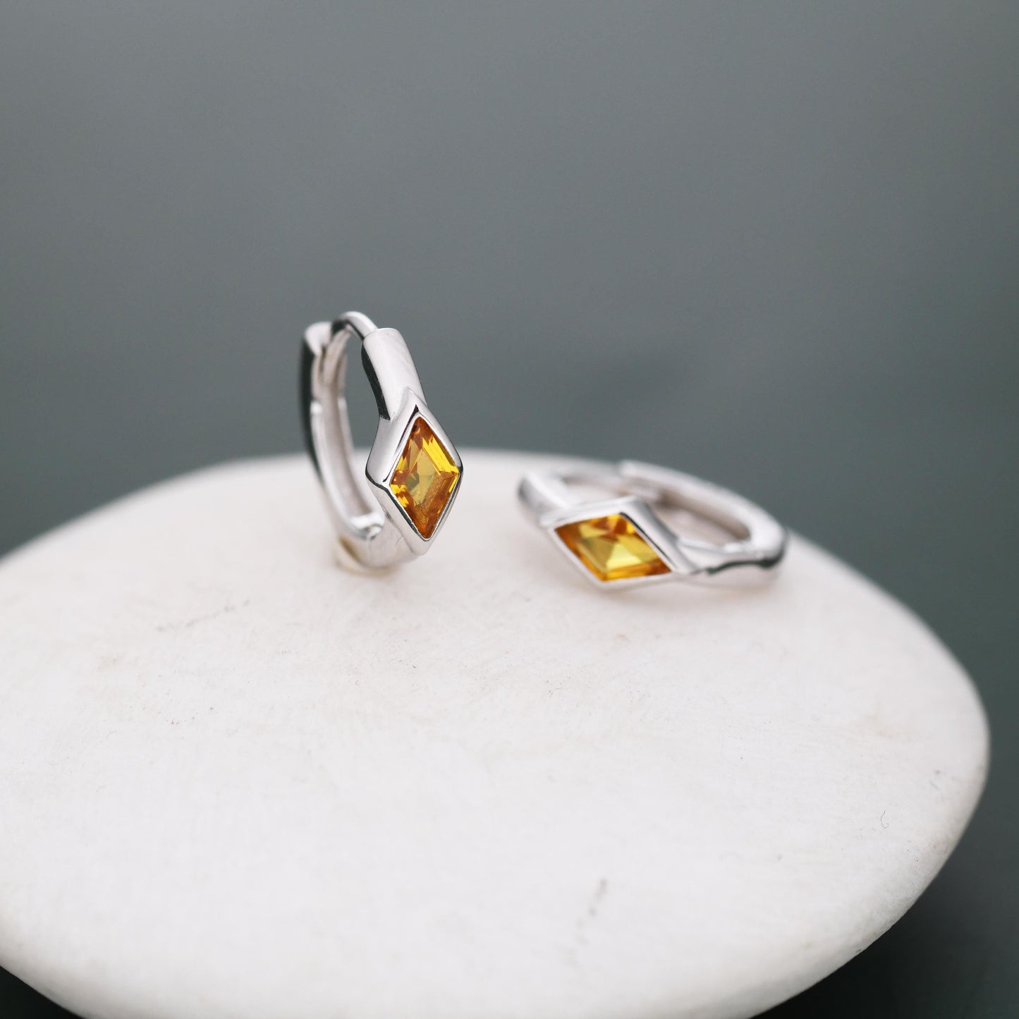 Tiny Rhombus Citrine Yellow CZ Huggie Hoop in Sterling Silver, Silver or Gold, Minimalist Simple Kite Shape CZ Hoop Earrings