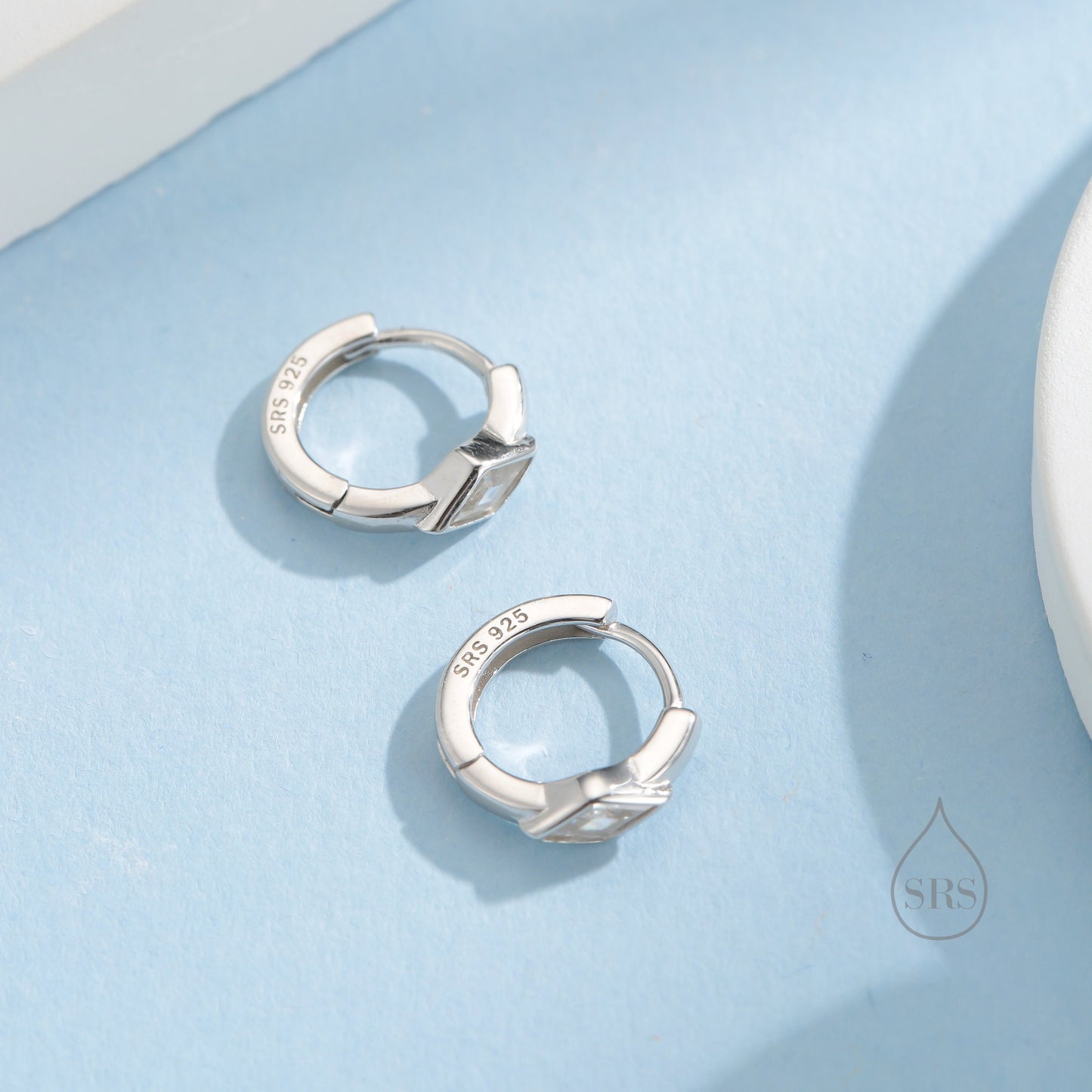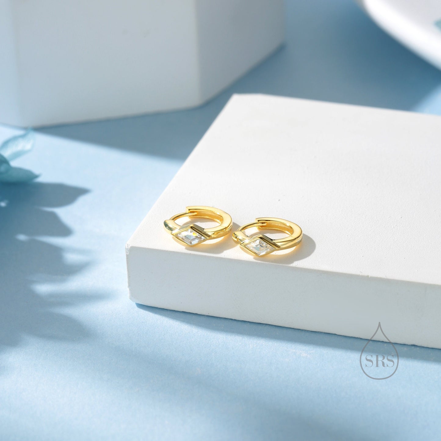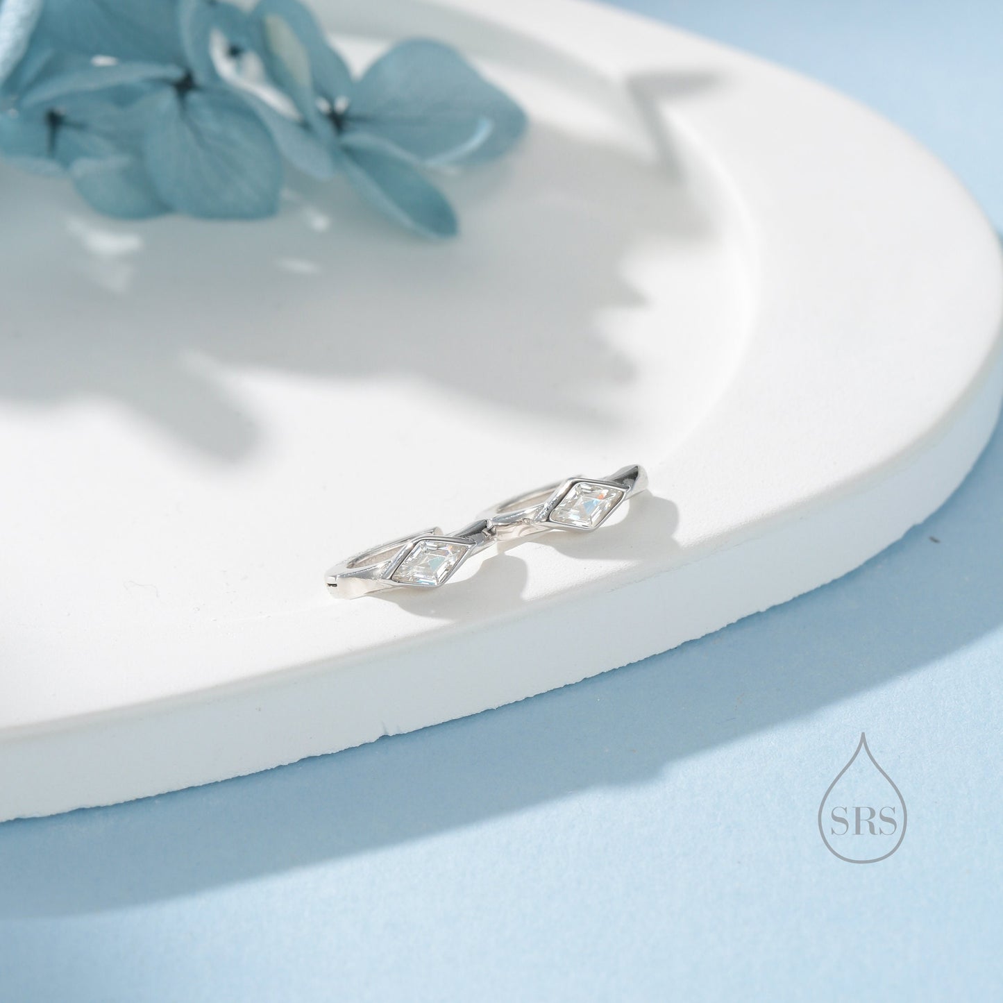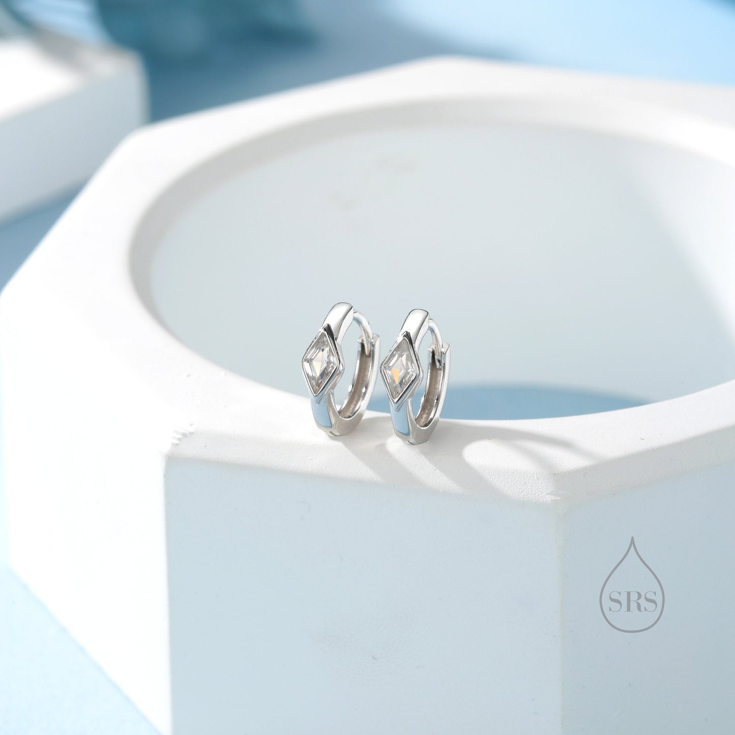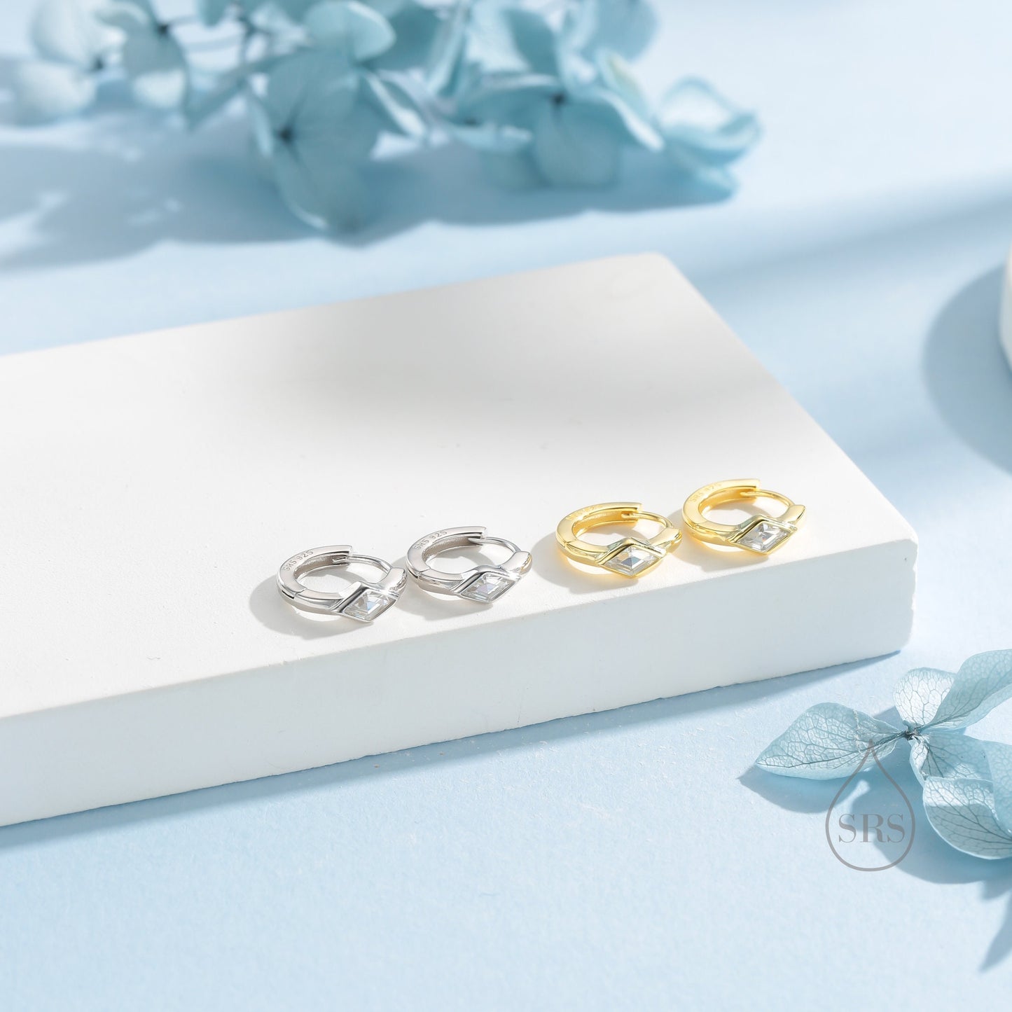 Tiny Rhombus Clear CZ Huggie Hoop in Sterling Silver, Silver or Gold, Minimalist Simple Kite Shape CZ Hoop Earrings