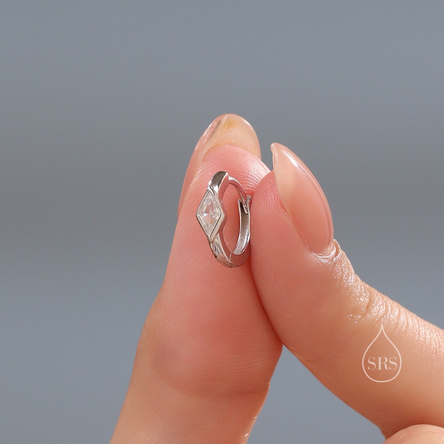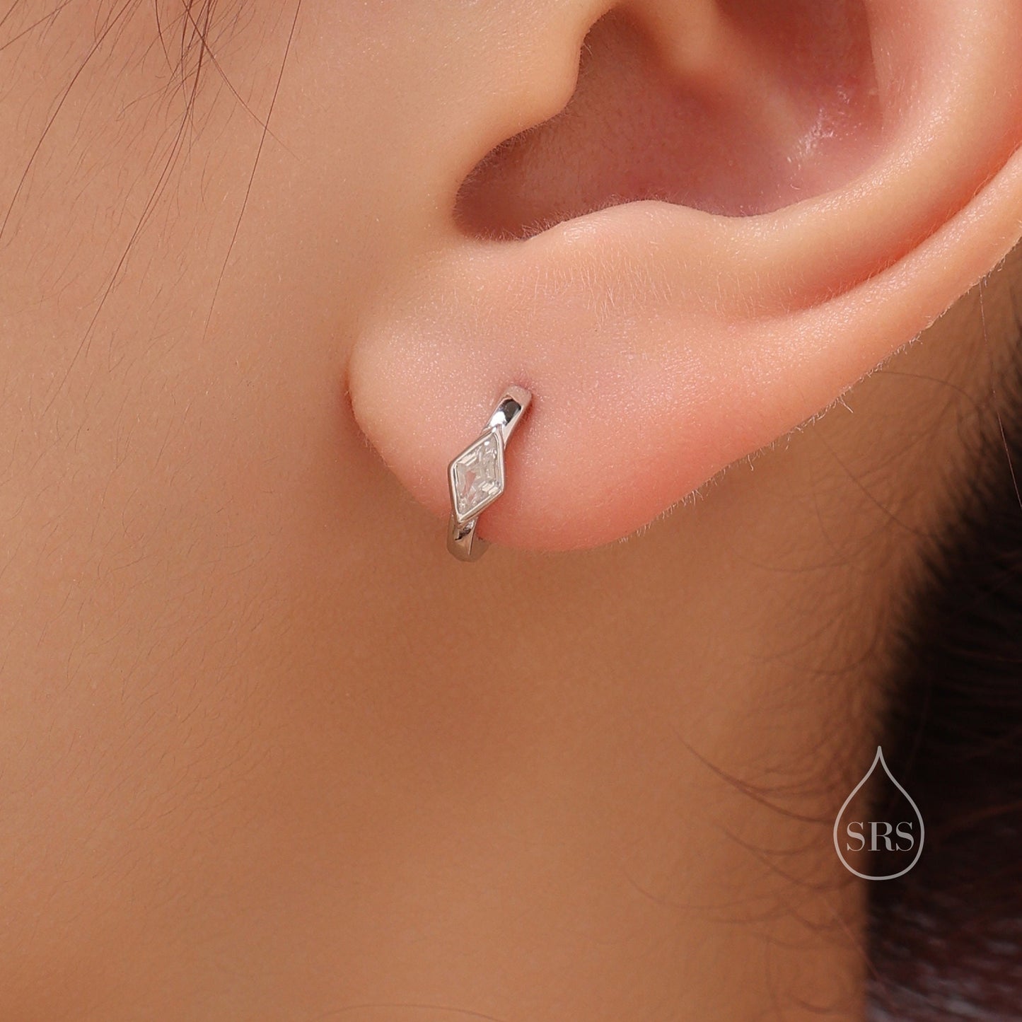 Very Tiny Rhombus Clear CZ Huggie Hoop in Sterling Silver, Silver or Gold, Minimalist Simple Kite Shape CZ Hoop Earrings