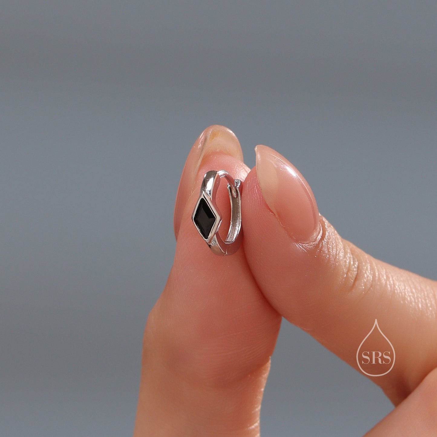 Very Tiny Rhombus Onyx Black CZ Huggie Hoop in Sterling Silver, Silver or Gold, Minimalist Simple Kite Shape CZ Hoop Earrings