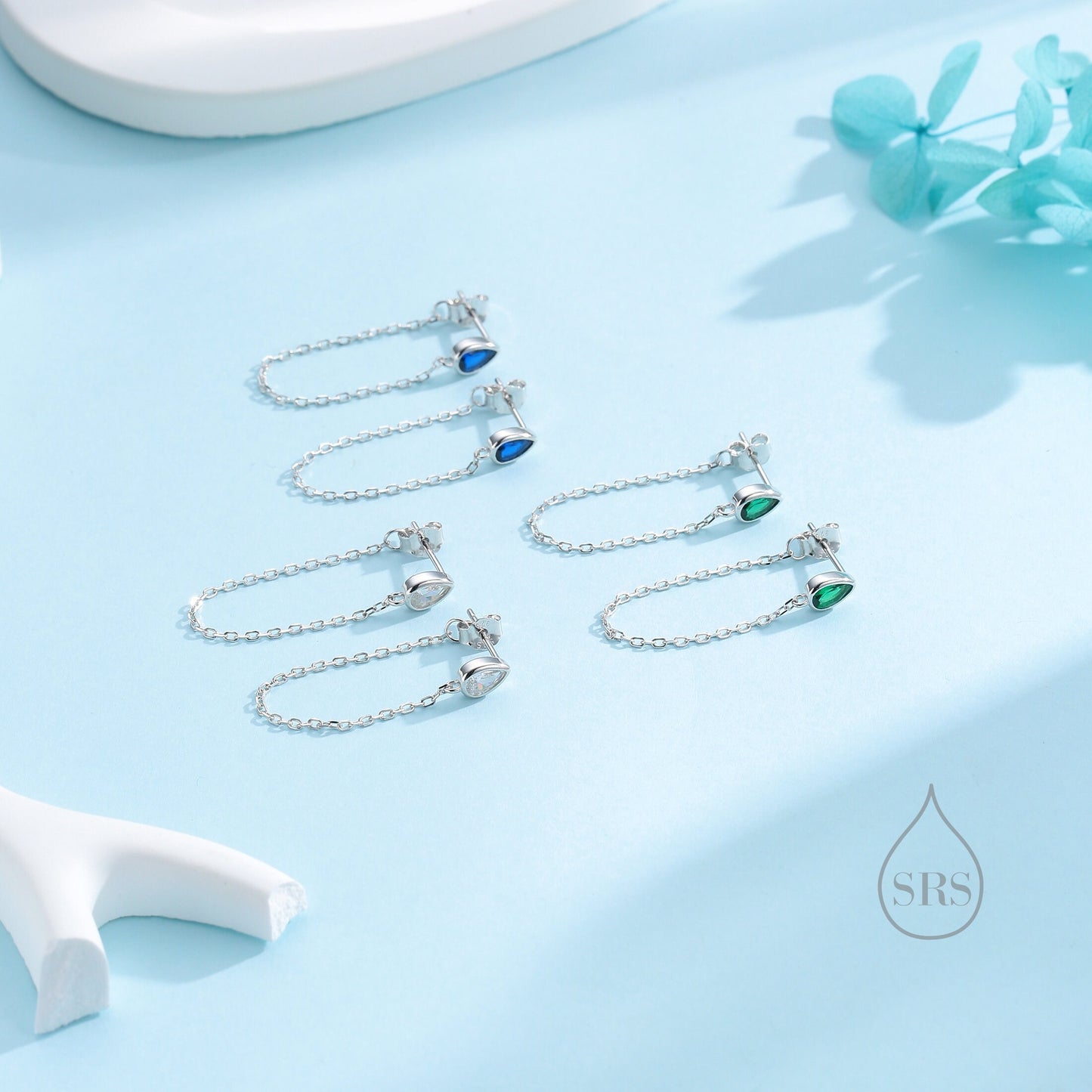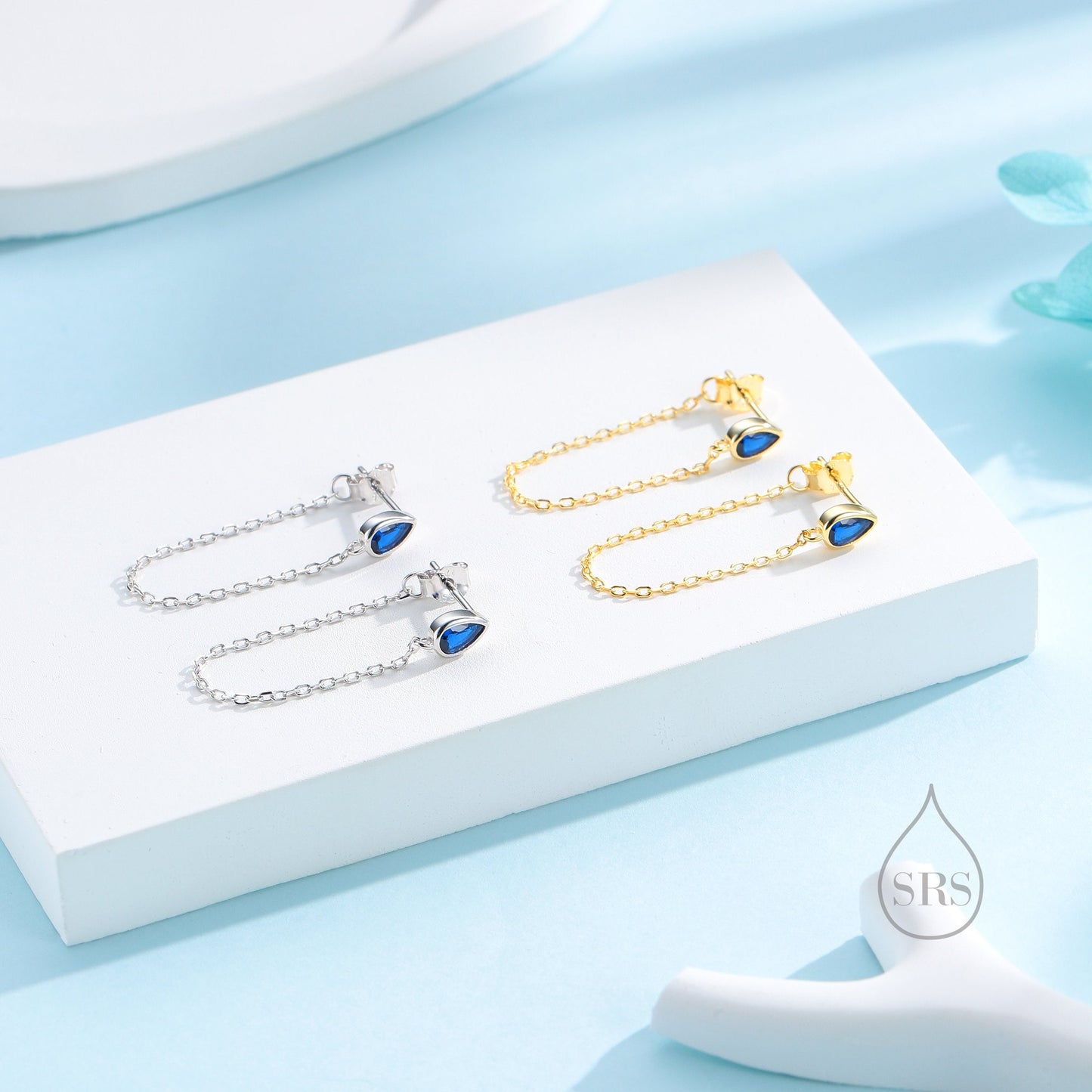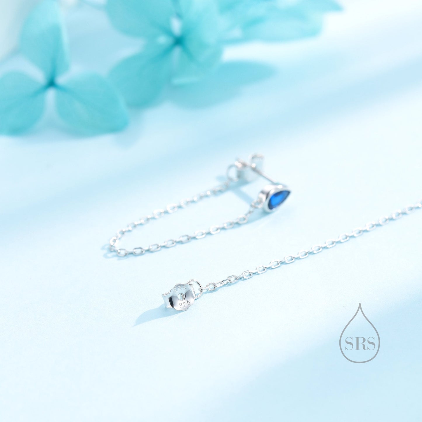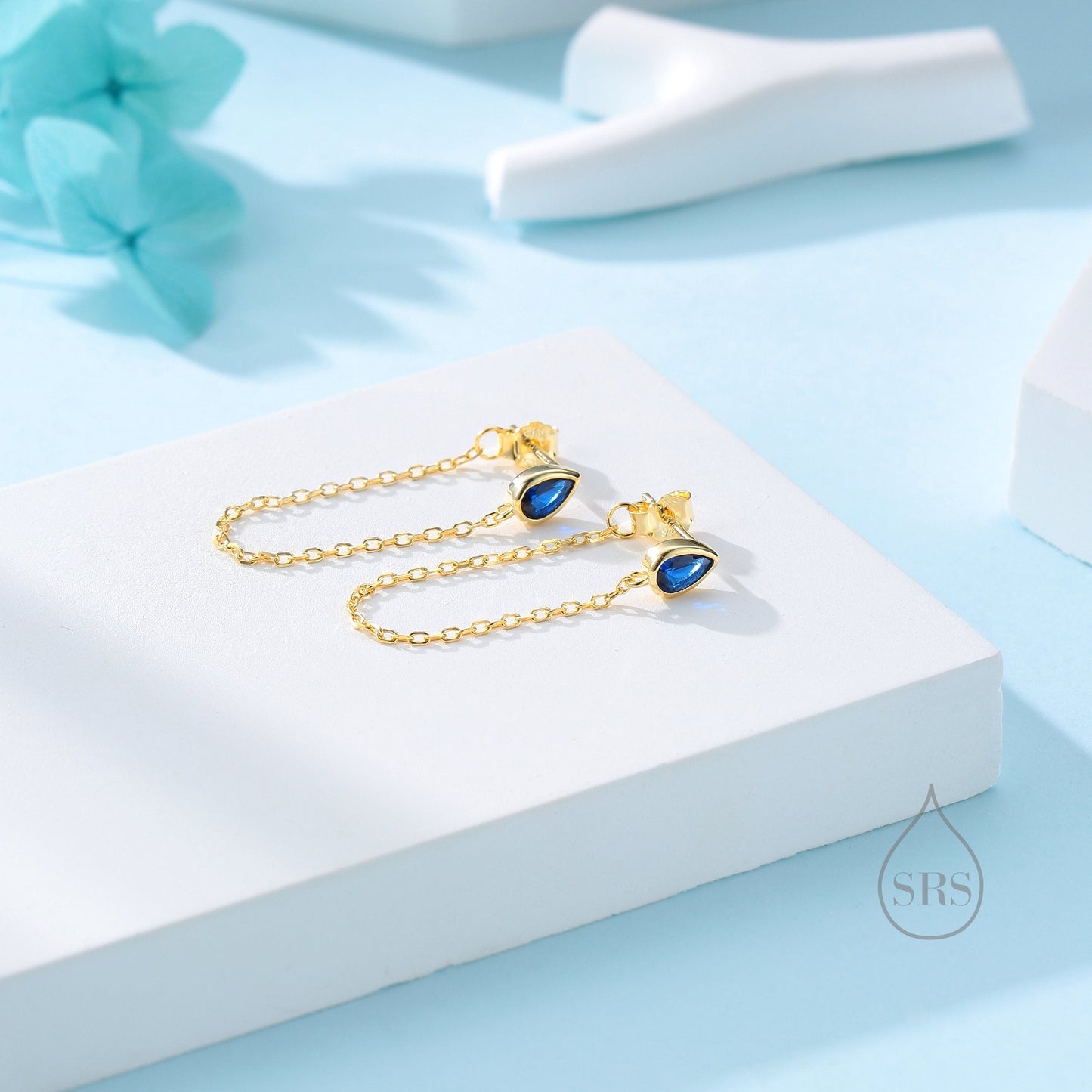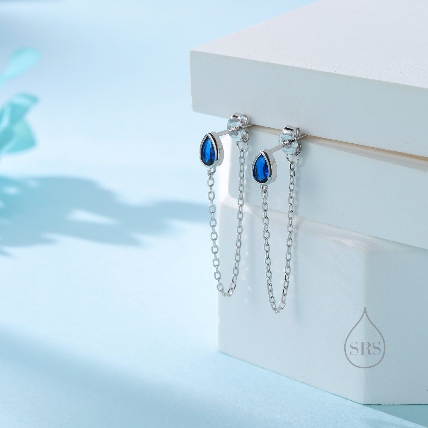 Tiny Sapphire Blue Droplet CZ Dangle Chain Stud Earrings in Sterling Silver, Silver or Gold, Pear Shape Ear Jacket, Front and Back Earrings