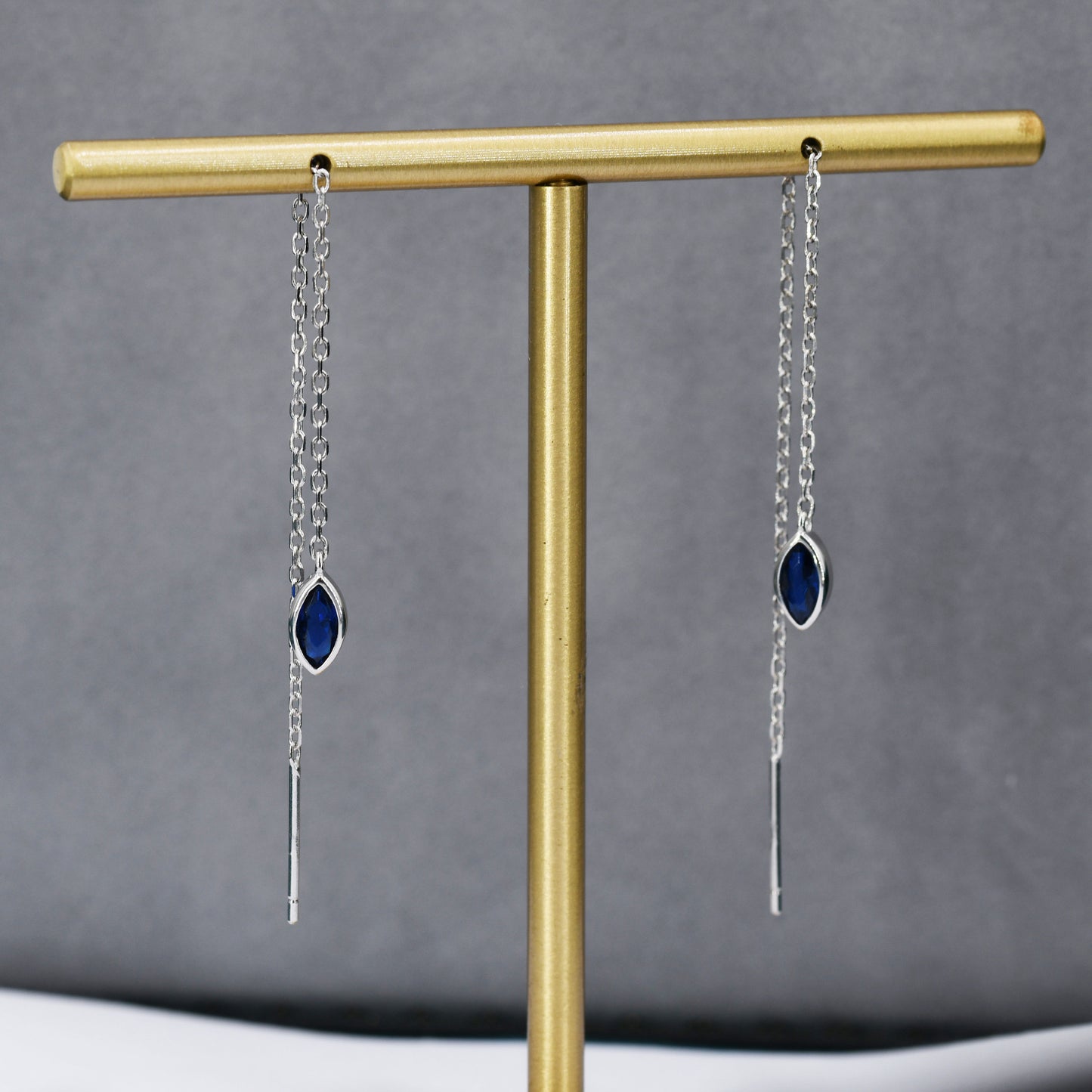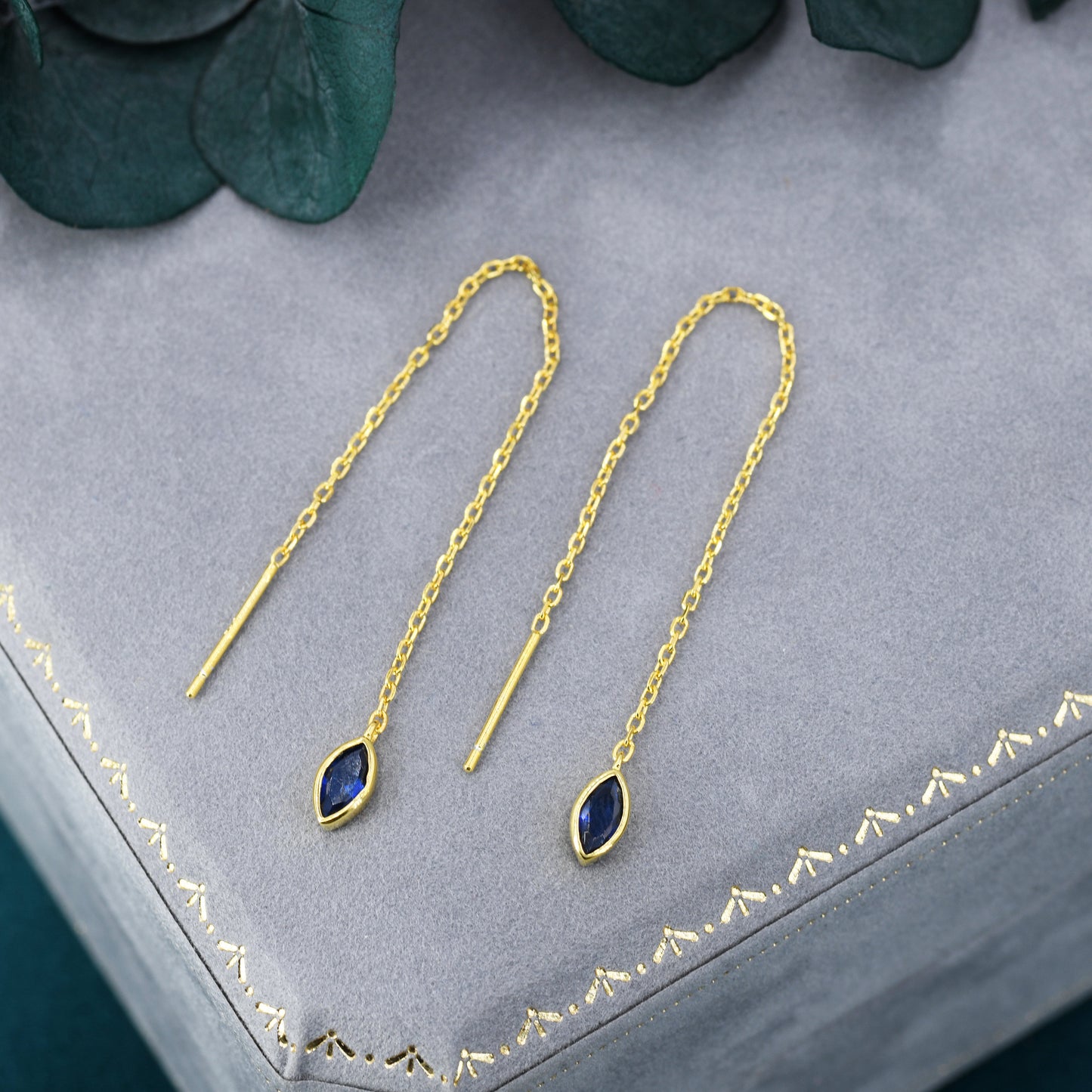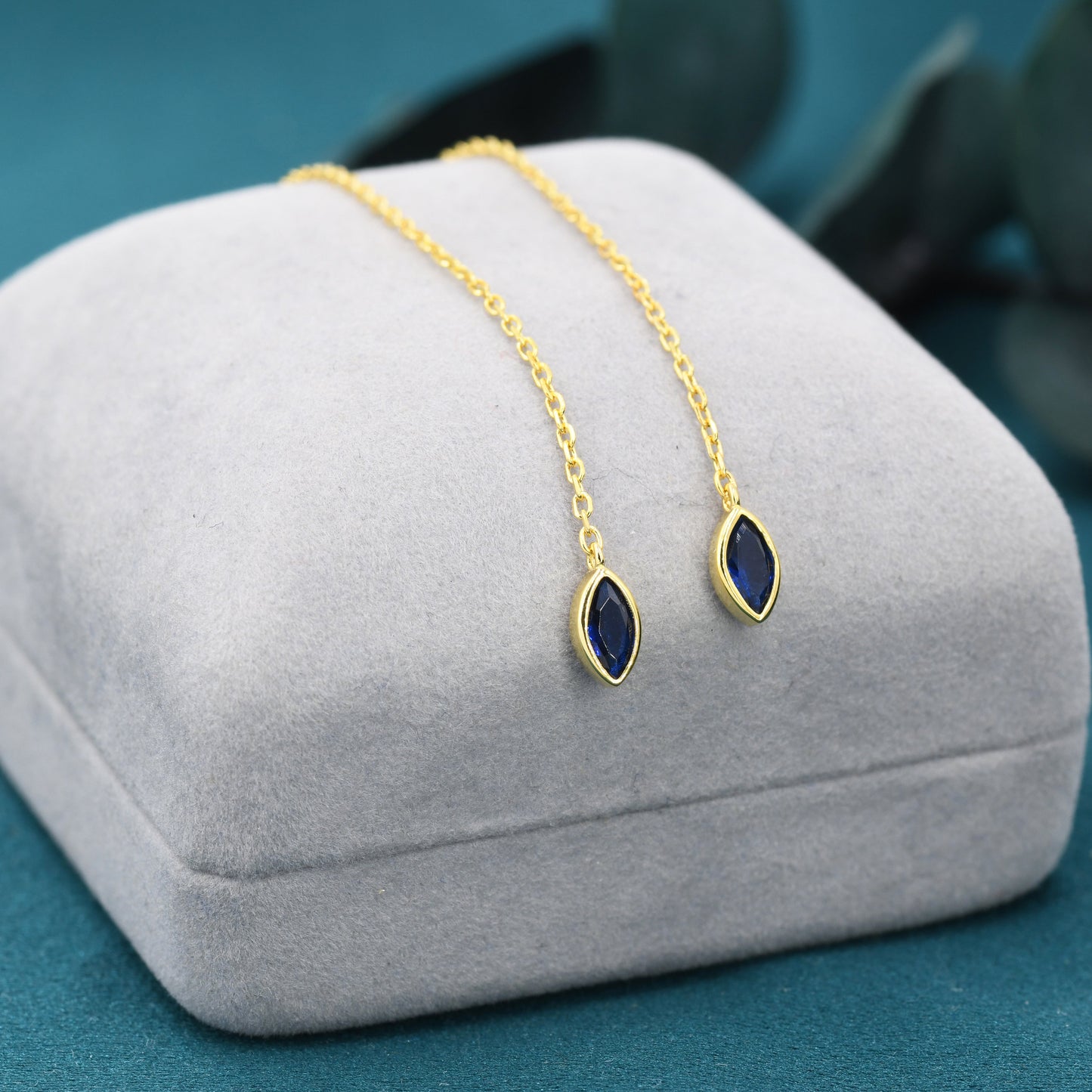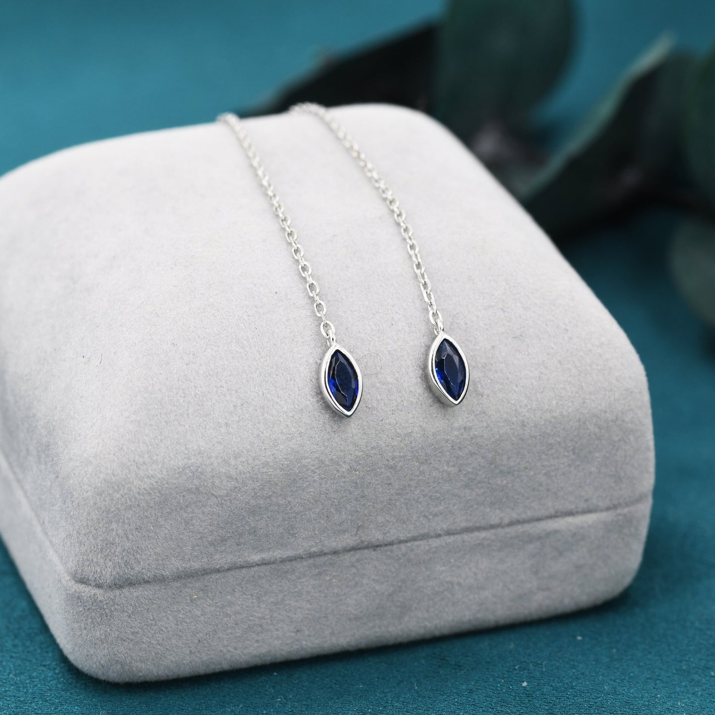 Tiny Sapphire Blue Marquise CZ Threader Earrings in Sterling Silver, Silver or Gold, Marquise Cut CZ Ear Threaders, Sparkly Threaders