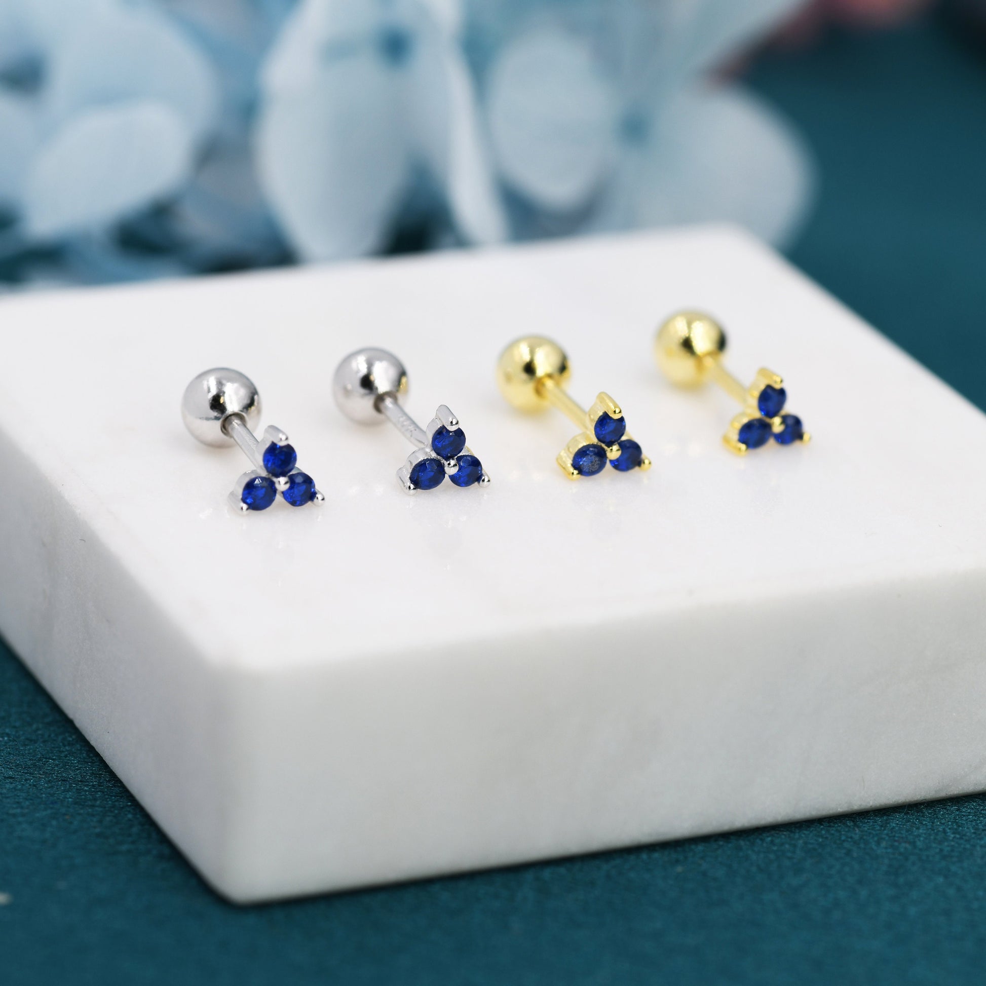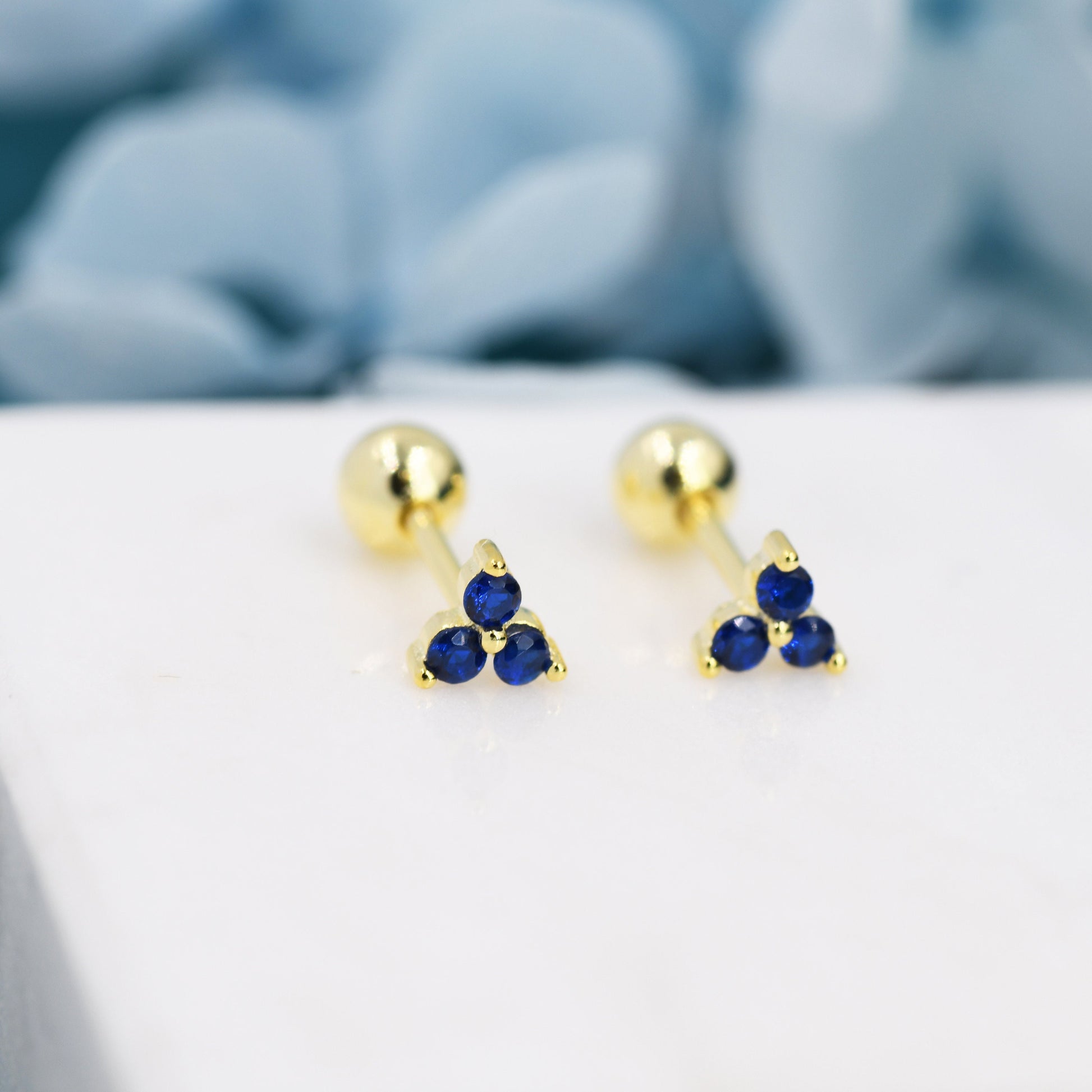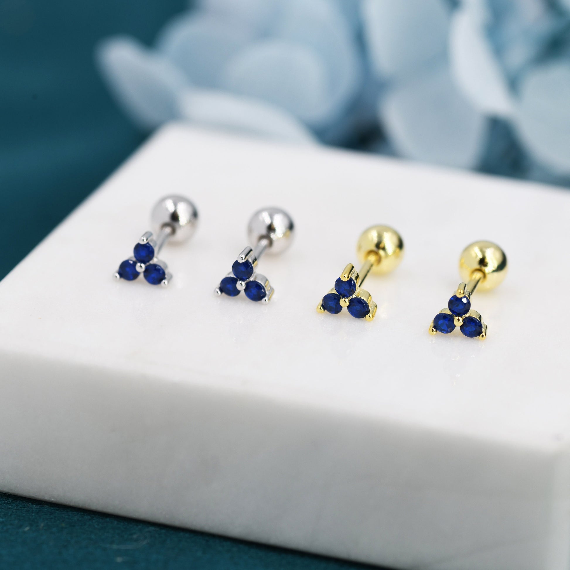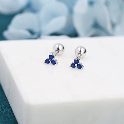 Tiny Three Sapphire Blue CZ Screw Back Earrings in Sterling Silver, Blue CZ Trinity Screwback, CZ Trio Earrings