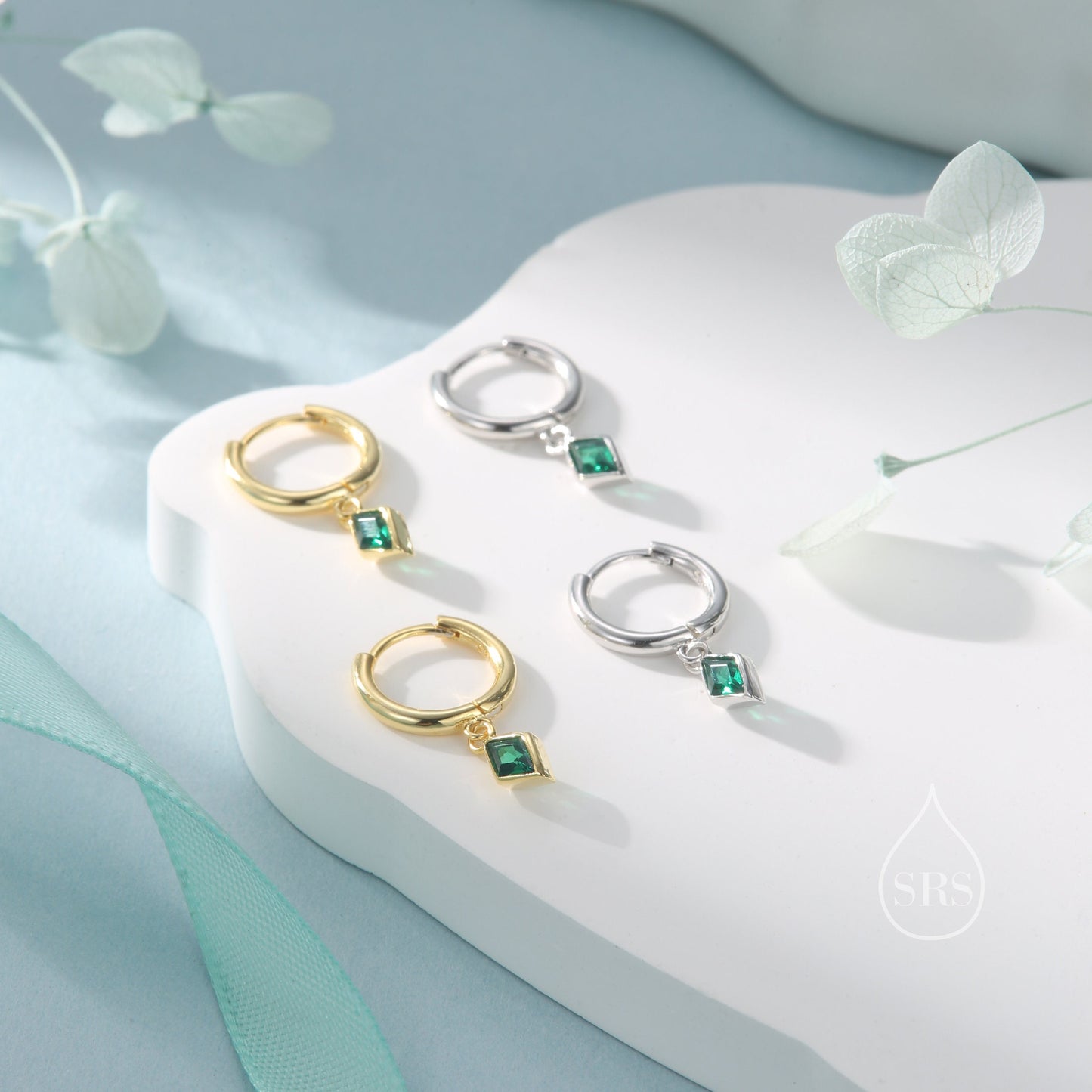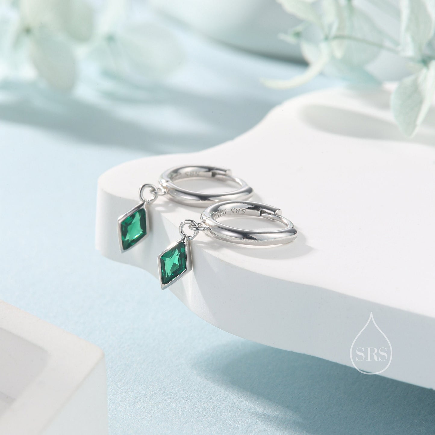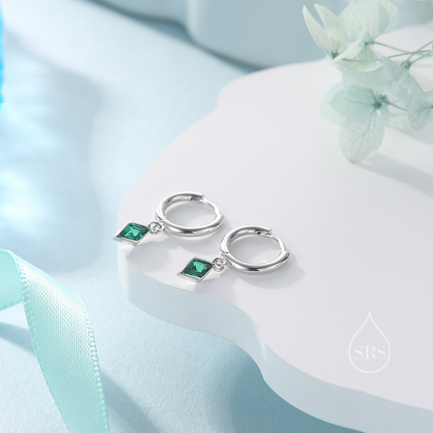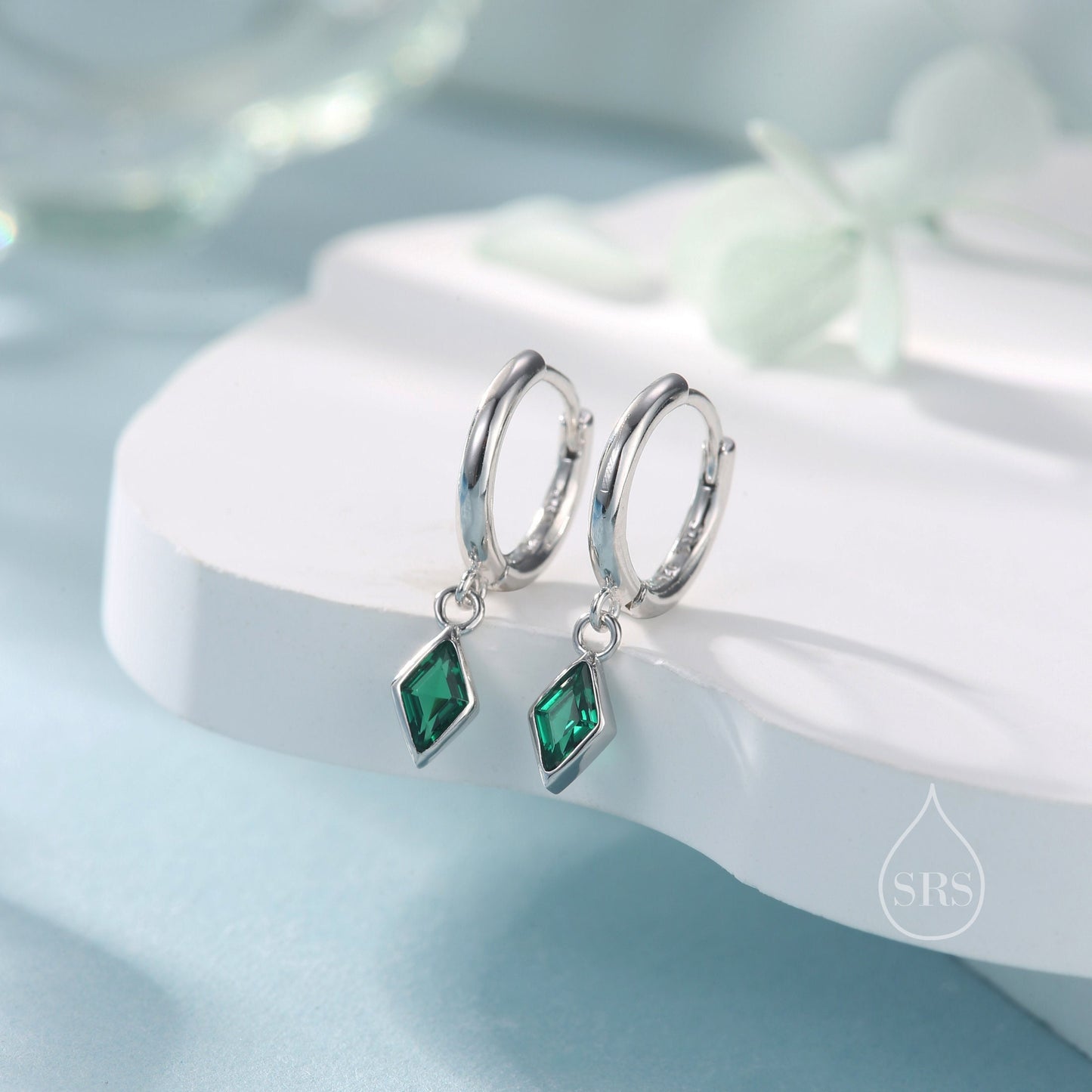Very Tiny Rhombus Emerald Green CZ Huggie Hoop in Sterling Silver, Silver or Gold, Minimalist Simple Kite Shape CZ Hoop Earrings