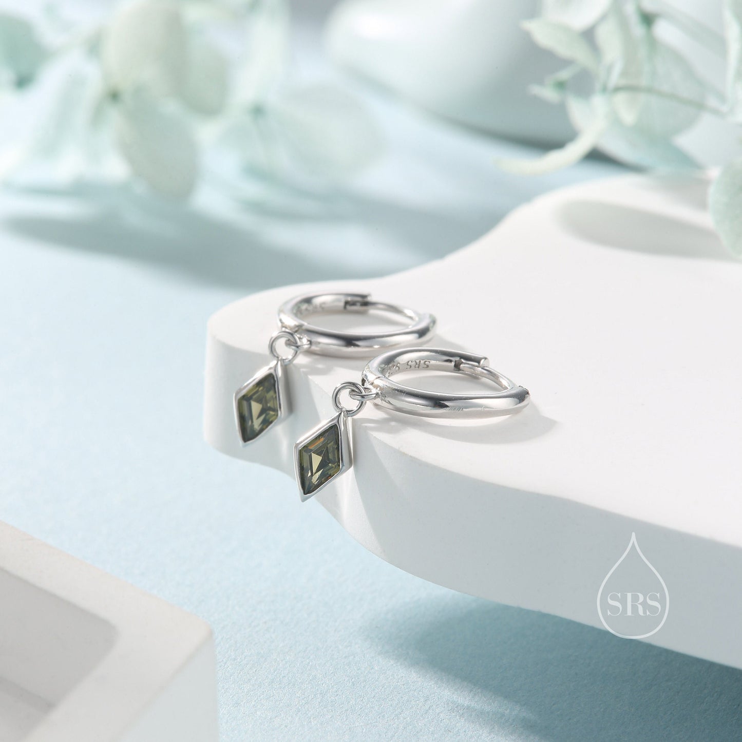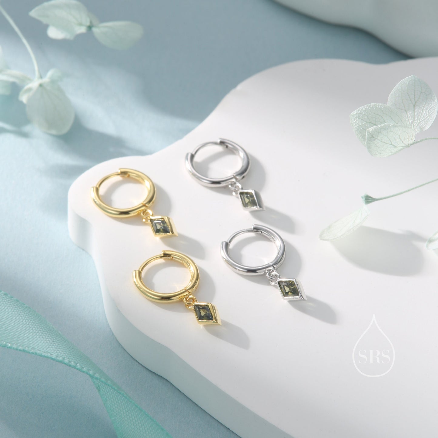 Very Tiny Rhombus Olive Green CZ Huggie Hoop in Sterling Silver, Silver or Gold, Minimalist Simple Kite Shape CZ Hoop Earrings