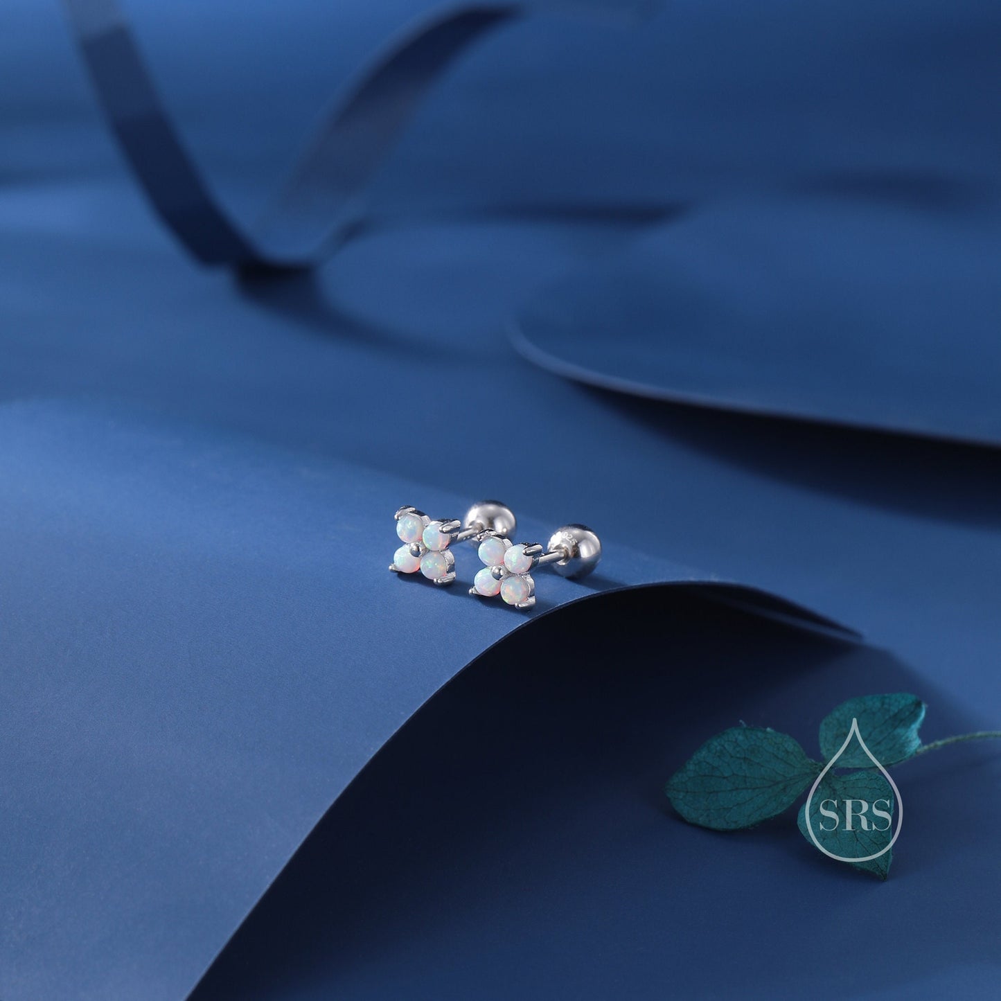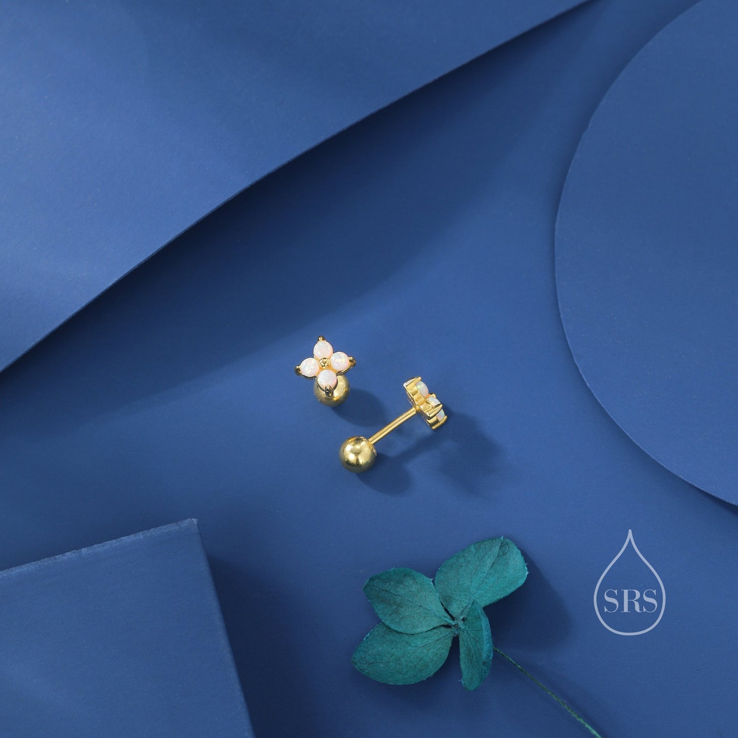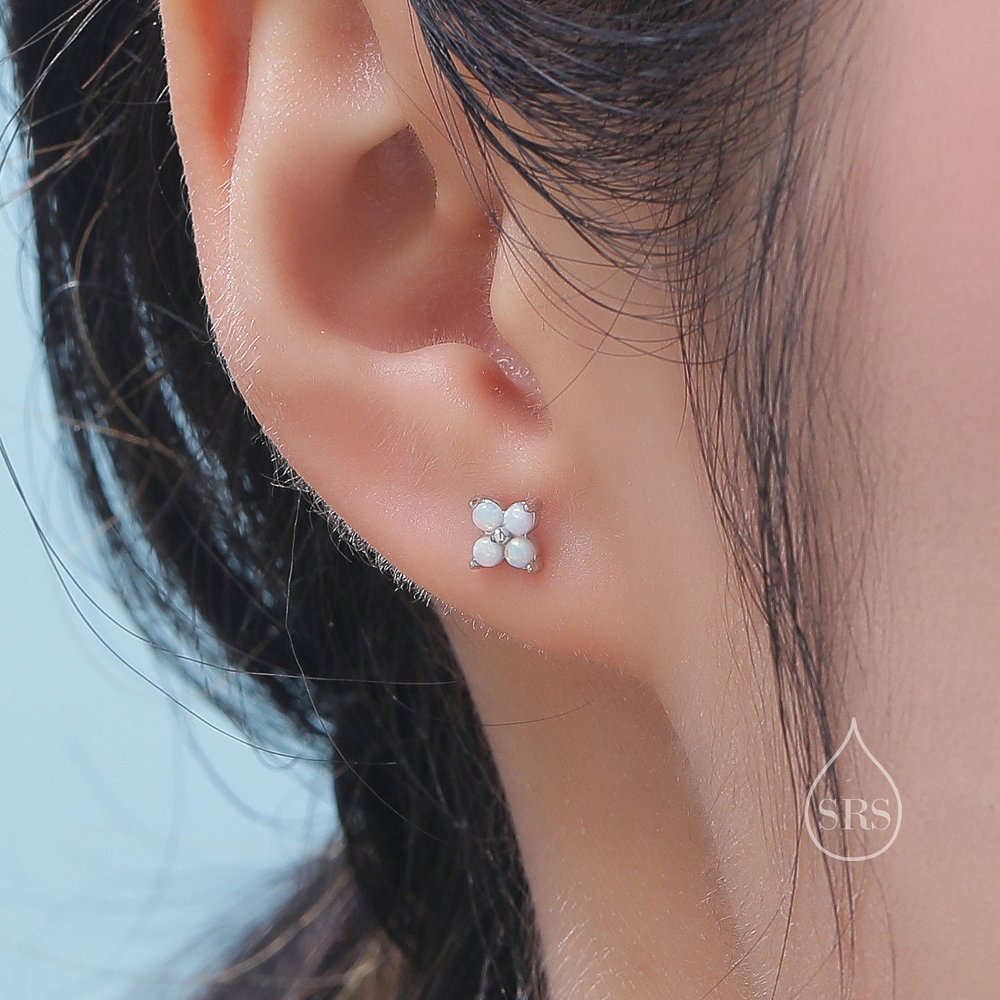 White Opal Hydrangea Stud Earrings in Sterling Silver - Gold or Silver - Opal Flower Earrings, Four Fire Opal Stud